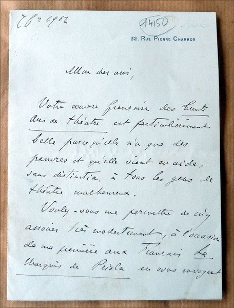 Une lettre autographe signée de 4 pp.; dimensions 11 x 15,5 cm au créateur de l'oeuvre de charité "Trente ans de Théâtre" censée soutenir les acteurs nécessiteux