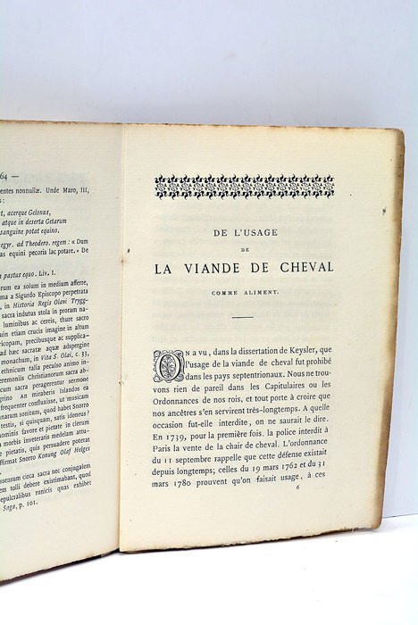 72 pages. (16 x 10,5 Cm). Broché, couverture imprimée sur vélin. Marques brunes et salissures. Petites manques de papier sur le 1er plat. Edition tirée à petit nombre sur papier vergé, de ce livre favorable à la consommation de la viande de cheval.
