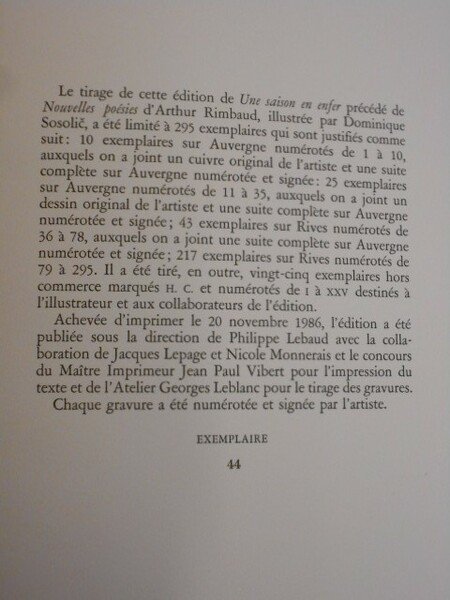 In 4°, cofanetto editoriale in piena tela nera con impressione in rosso al dorso, all'interno una cartella in cartoncino rigido e sovraccoperta con pp. 65,(7) a fascicoli sciolti e 10 incisioni di Dominique Sosolic, una cartella in brossura con all'interno una suite di identiche tavole dell'artista. Tutte le incisioni originali, protette da doppia velina, sono numerate e firmate a matita dall'autore. Edizione di 295 copie, il nostro esemplare (n. 44) fa parte della serie di 43, stampata su carta Rives con aggiunta la suite su carta d'Auvergne, numerata da 36 a 78. Ottimo stato di conservazione.