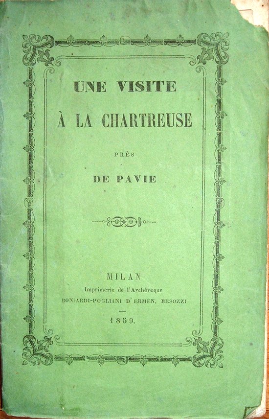 In-16° (cm 17,6x11), pp. 65, (3), copertina editoriale con normali tracce d'uso e piccola mancanza nell'angolo superiore esterno della copertina anteriore. Con tre tavole fuori testo più volte ripiegate, raffiguranti, la prima, in antiporta, "Veduta della Certosa presso Pavia - Vue de la superbe Eglise la Chartreuse pres de Pavie" (cm 24,7x17,6); la seconda, tra le pp. 28 e 29, il mausoleo di Gian Galeazzo Visconti (cm 16,6x25,4); la terza una pianta dettagliata della Certosa (cm 24,5x17,6). Alla seconda di copertina, etichetta in carta della "Cartoleria e libreria di Joun Carlo di Borgomanero". Leggere tracce d'umido a qualche pagina, per il resto ottimo esemplare. In lingua francese. Table: Préface; Précis historique sur la fondation; Vestibule d'entrée dans la cour de l'église; Façade du temple; Intérieur du temple; Chapelle de sainte Véronique; Chapelle de saint Hugues; Chapelle de saint Benoit; Chapelle du Crucifix; Chapelle de saint Syr; Chapelle de saints apôtres Pierre et Paul; Chapelle de l'Annonciation; Mausolée de Jean Galéas; Autel de saint Bruno; La Sacristie neuve; Lavoir des Religieux; Centre de l'Église; Choeur des Religieux et grand autel; L'ancienne Sacristie; Autel des saintes Reliques; Chapelle de saint Rosaire; Chapelle de saint Ambroise; Chapelle des deux saints Chaterines; Chapelle de saint Joseph; Chapelle de saint Jean Baptiste; Chapelle de saint Michel; Chapelle de sainte Marie Magdelaine; Le petit Cloître; Le grand Cloître; Notice sur les Chartreux; Inscription.
