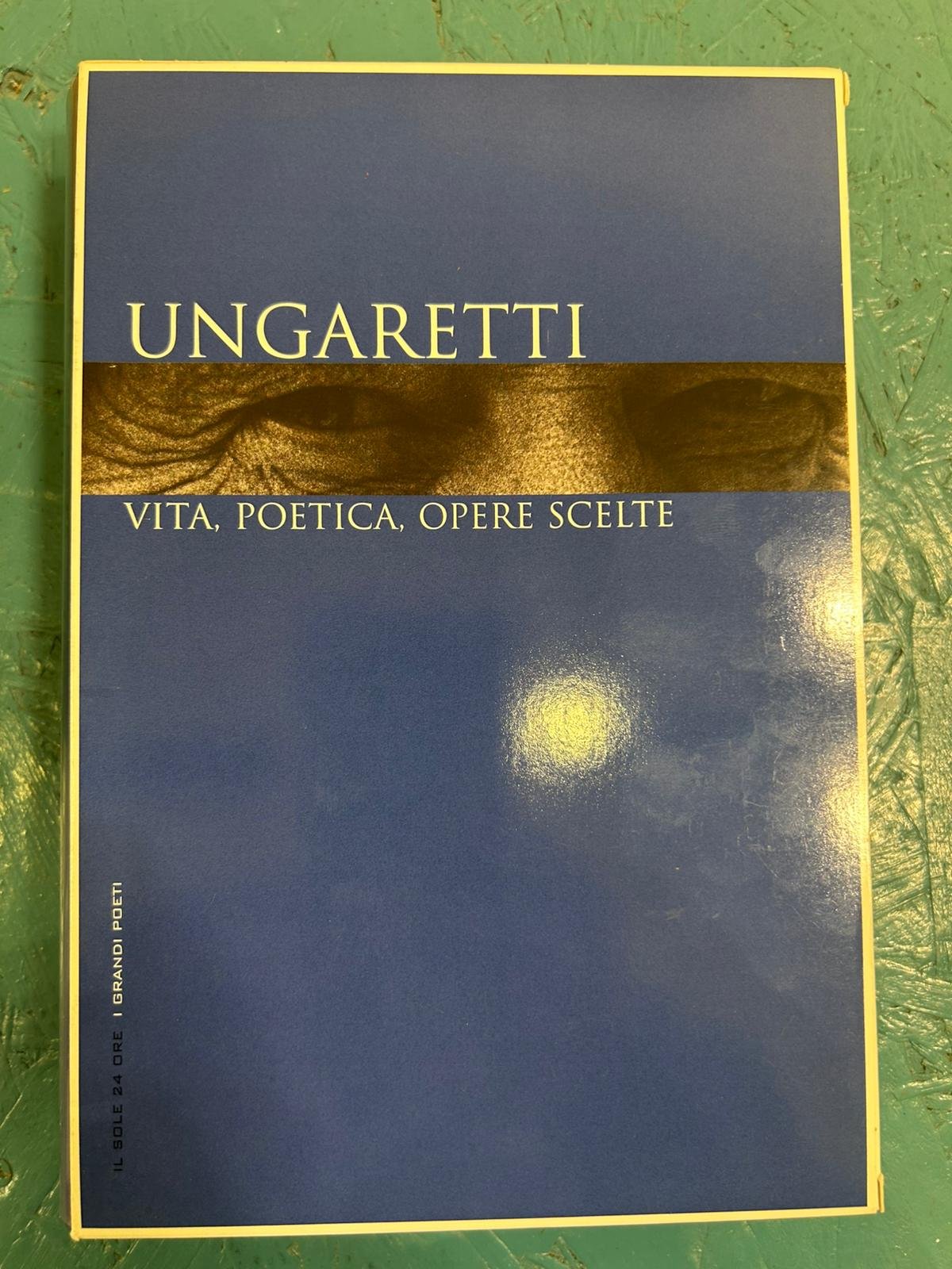 Ed. speciale per Il Sole 24 Ore. 605 p. : ill. ; 22 x 15 cm. I grandi poeti, 1. Giuseppe Ungaretti è stato uno dei principali poeti della letteratura italiana del XX secolo. Inizialmente influenzato dal simbolismo francese, la sua poesia fu caratterizzata nei primi tempi da componimenti brevissimi, costituiti da poche parole essenziali e da analogie a volte ardite, compresi principalmente nella raccolta L'allegria (1916); passò poi a lavori più complessi e articolati dal contenuto concettualmente difficile. Una terza fase della sua evoluzione poetica, segnata dal dolore per la perdita prematura del figlio, ha compreso opere meditative dall'intensa riflessione sul destino umano. Negli ultimi anni le sue poesie furono specchio della saggezza, ma anche del distacco e della tristezza dell'età avanzata. «La poesia è poesia quando porta in sé un segreto» (Ungaretti G.) A cura di Anna De Simone e Pierluigi Cappello. Legatura editoriale, coperta in cartone rigido, illustrata in b/n, col titolo impresso in bianco al dorso e muto al piatto. Sovraccoperta in plastica semitrasparente. Cofanetto in cartone flessibile, illustrato a colori. All'interno numerose illustrazioni e fotografie in b/n e a colori.