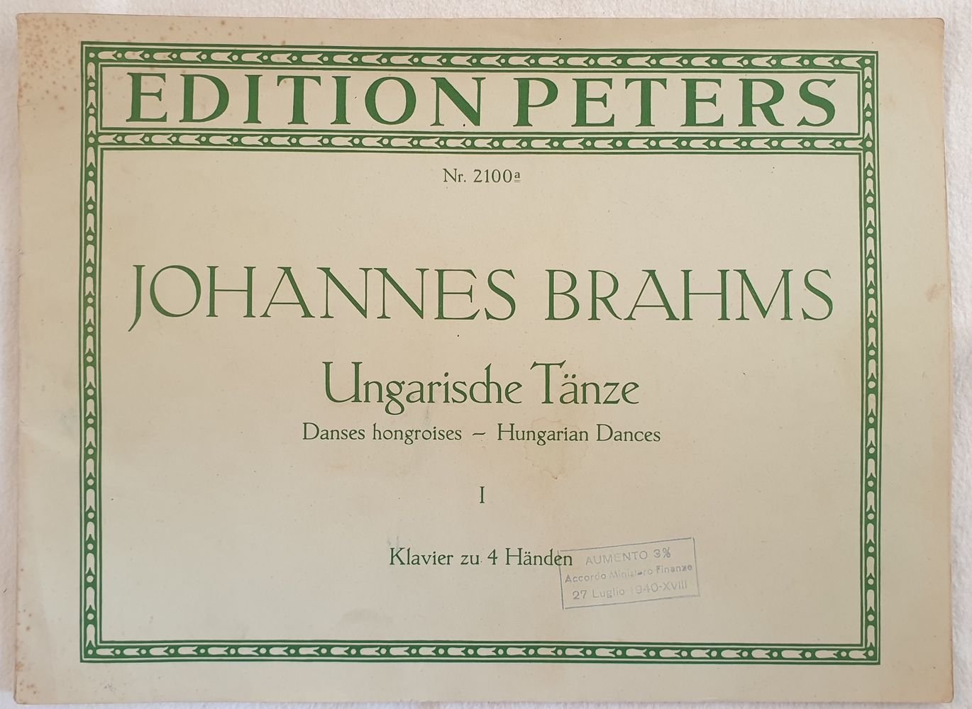 Spartito musicale per pianoforte a quattro mani degli anni '30 della melodia "Ungarische Tanze I" dall'opera 314 di Johannes Brahms (1833-1897). In ottime condizioni. Brossura editoriale in ottime condizioni generali con lievi usure ai margini e dorso. Legatura in buone condizioni. All'interno le pagine si presentano in ottime condizioni con rare fioriture. Formato Album. Dim. 23x31 cm. Pp. 51+(1).Musical score for piano four hands of 1930's of the melody "Ungarische Tanze I" by JJohannes Brahms (1833-1897). In very good conditions. Editorial cover in very good conditions slightly worn in the edgeds and spine. Binding in good conditions. Pages in very good conditions with occasional foxings.<BR>Album size. Dim. 23x31 cm. Pp. 51+(1).