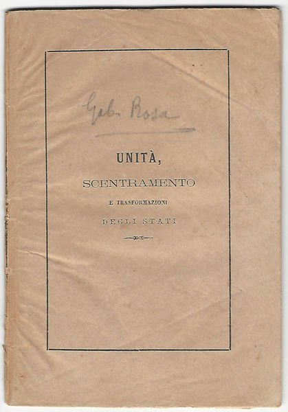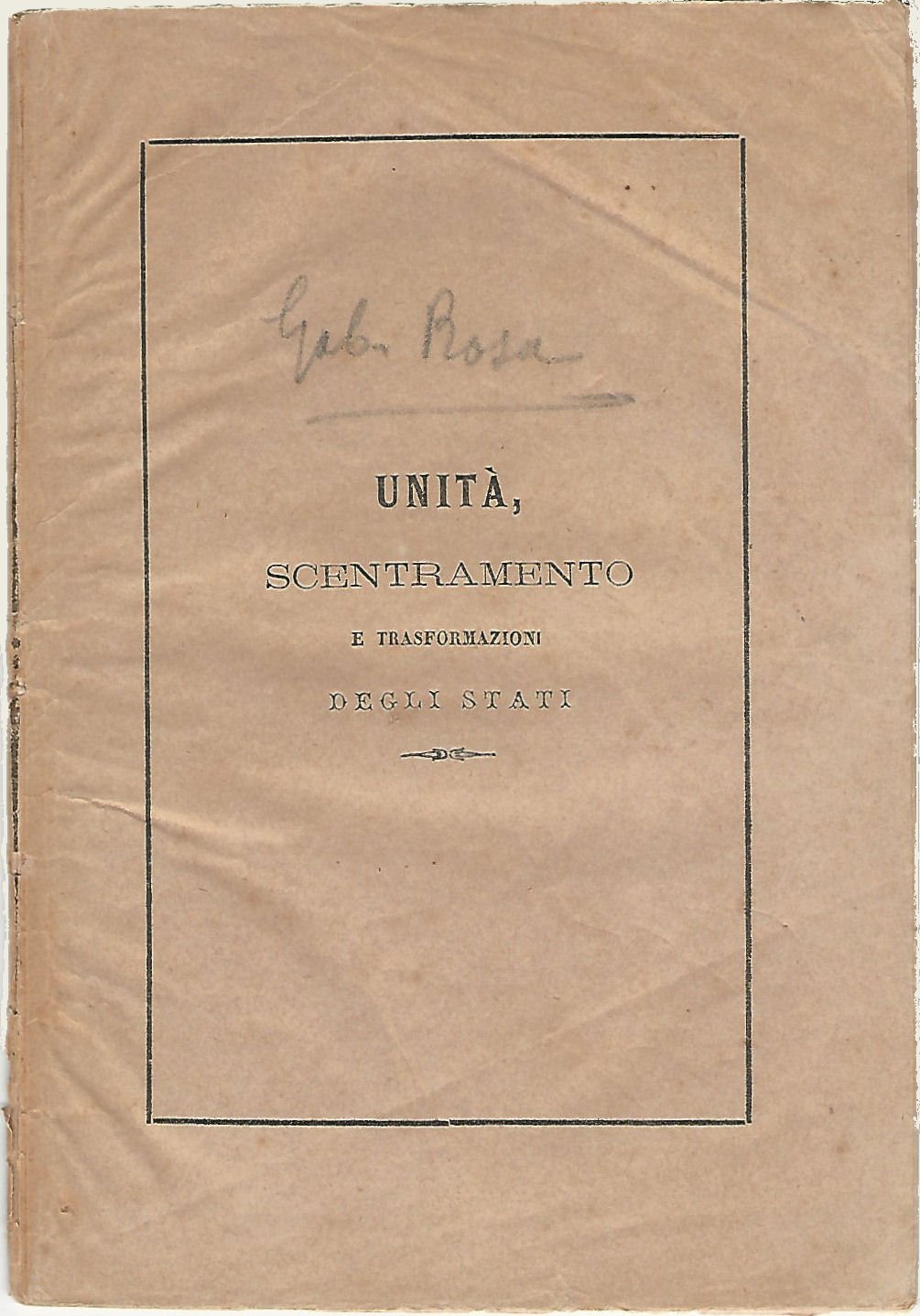 In 16, p. 52, br. orig.; alcune postille a matita. - Rara pubblicazione (mai stata presente sul mercato on-line) sul Federalismo del patriota lombardo con pensieri sulle teorie politiche di Proudhon, Cattaneo, Mazzini etc.