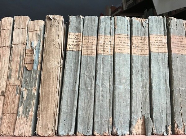 Undici volumi in 4 grande (su 13), brossure originali azzurrine (mende e mancanze), titoli al tassello al dorso, sguardie, frontespizi, prefazione, dedicatoria, XII, 523,488, 491, 504, 481,450, 462, 448 pp., per i primi otto tomi, consecutivi, contenenti interamente i Liber Primus et Secundus; 429, 433 pp., per il decimo ed undicesimo tomo, contenenti i Liber Tertius dal tit. 11 alla fine, e Liber Quartus dallinizio al tit. 34; 304 pp., per il tomo tredicesimo contenente lindice generale. Questa particolare Editio Secunda ha la peculiarit di essere stata stampata non pi solo a spese dellautore, insigne giurista cuneese (e compartecipazione delleditore) ma anche a spese degli associati: si tratta di 150 nomi, soprattutto avvocati, notai, magistrati, librai, ecc., che hanno espressamente richiesto una nuova edizione essendo la prima non pi disponibile, il cui elenco compare al fondo del primo tomo. Articolata in quattro libri (di cui il pi corposo risulta essere il 2 che si sviluppa in 7 dei tredici tomi complessivi), ciascun libro diviso a sua volta in titoli e capi, preceduti tutti da un breve sommario e dallindicazione dei precisi rimandi al diritto romano giustinianeo. Questopera giustamente considerata di fondamentale importanza per la conoscenza del diritto comune anche per lesposizione chiara, senza troppe connotazioni locali, tanto da resistere allintroduzione del Codice Napoleonico. Opera stampata su bella carta forte, testo su doppia colonna, ad ampi margini, in barbe. Molto rara ed importante.