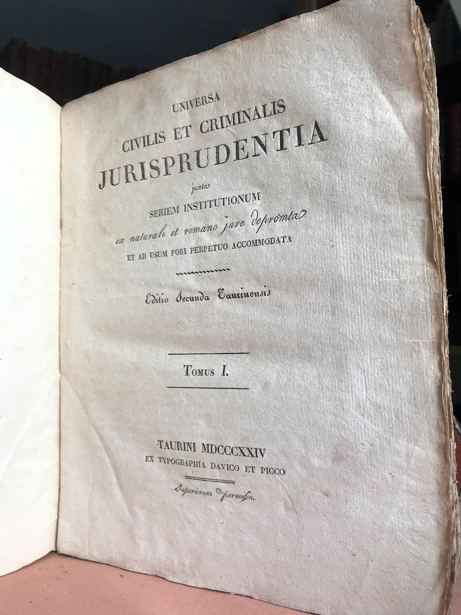 UNIVERSA CIVILIS ET CRIMINALIS JURISPRUDENTIA. Juxta seriem Institutionum ex naturali, et romano jure depromta et ad usum fori perpetuo accomodata. Editio Secunda Taurinensis.