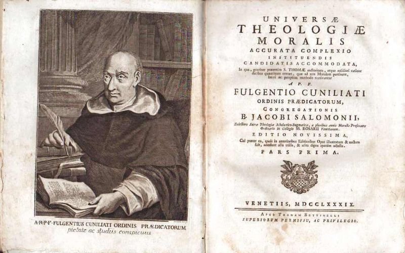Due volumi in-4° (cm 25,5 x 20), legatura coeva in cart. alla rustica con titoli calligrafici ai dorsi, pp. XVI-580 e VIII-464; testo su due colonne. In antiporta ritratto dell’autore inciso da Zucchi. Fulgenzio CUNILIATI, nato a Venezia nel 1685 da padre lionese che nella città esercitava la chirurgia, studiò teologia e filosofia entrando nella congregazione domenicana del beato Giacomo Salomoni nel 1701. Moralista, predicatore, professore di teologia, morì a Venezia il 1759. Legature parzialmente stacate dal corpo dei volumi; per il resto buon esemplare.