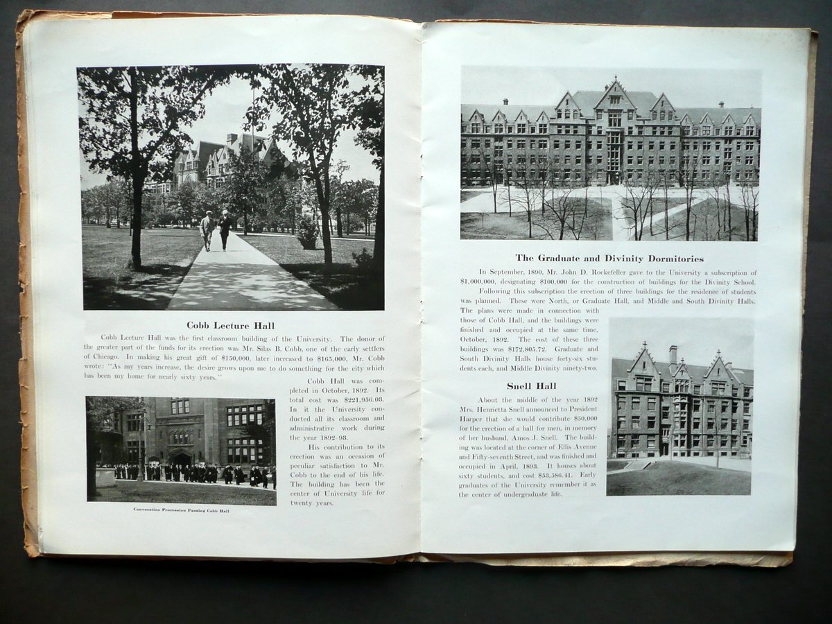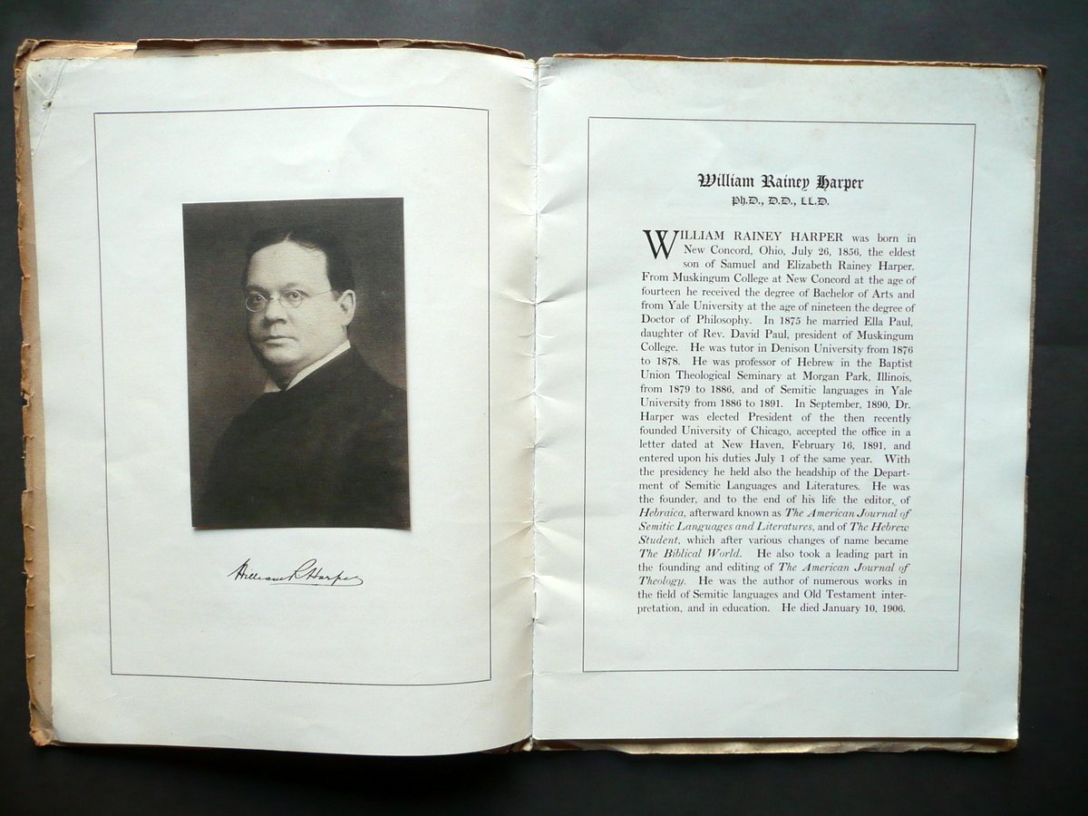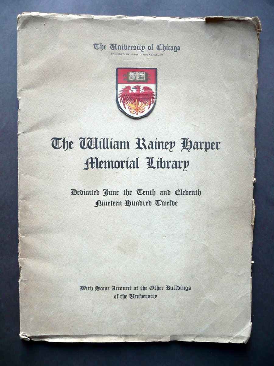 The University of Chicago - The William Rainey Harper Memorial Library Dedicated June the Tenth and Eleventh Nineteen Hundred Twelve With some account of the other building of the University 1912; cm 32x23,5, pp. non num. (pp. 32), con numerose ill. fotogr. in b/n nel t.; antiporta con applicato un ritratto fotogr. in b/n dell'Harper (vedi foto); brossura ed. con blasone a col. dell'Università di Chicago applicato alla parte sup. della brossura ant. Testo in inglese. Condizioni di conservazione Esemplare complessivamente ben conservato con tracce d'uso, alcune piccole lievi bruniture e aloni; qualche leggera traccia di sporco; margini e angoli delle brossure con tracce di pieghette e alcuni minimi strappetti. Con numerose illustrazioni fotografiche non solamente della Biblioteca William Rainey", ma anche di altri edifici e sedi di facoltà dell'Università di Chicago. Testo in inglese. SETT106.L10209 N "