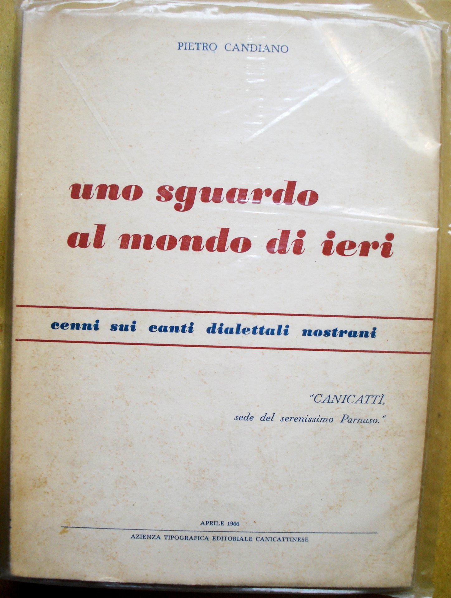 UNO SGUARDO AL MONDO DI IERI - MOTTI, FRIZZI, SENTENZE. CENNI SUI CANTI DIALETTALI NOSTRANI., " CANICATTI' "sede del serenissimo Parnaso.