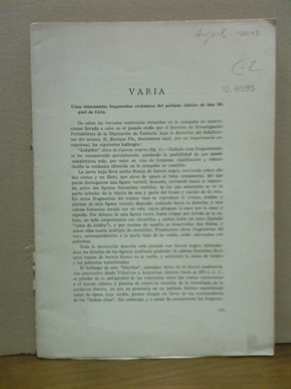 [S.l.]: [s.n.], [ca. 1950].- P. 435-452 (en total 18 p.): una lámina impresa por ambas caras; 4º mayor (28 x 20 cm.); Cubiertas provisionales.- Desglosado de alguna revista de la que no tenemos referencia. CONTIENE: Unos Interesantes fragmentos cerámicos del poblado ibérico de San Miguel de Liria, por D. Fletcher Valls; Un bronce hispánico inédito en el British Museum, por Luis Fernández Fuster; El I Congreso Internacional de Prehistoria Mediterránea, El Congreso de Prehistoriadores alemanes celebrado en Maguncia, El I Congreso Internacional de Estudios Pirenaicos de San Sebastián, El III Congreso Internacional de Ciencias Prehistóricas y Protohistóricas, los cuatro artículos, por L. Pericot.* Al tratarse de un desglose carece de cubiertas y se le han puesto unas provisionales en papel. ARTE ANTIGUO Y ARQUEOLOGÍA