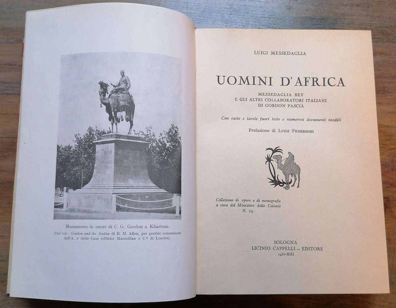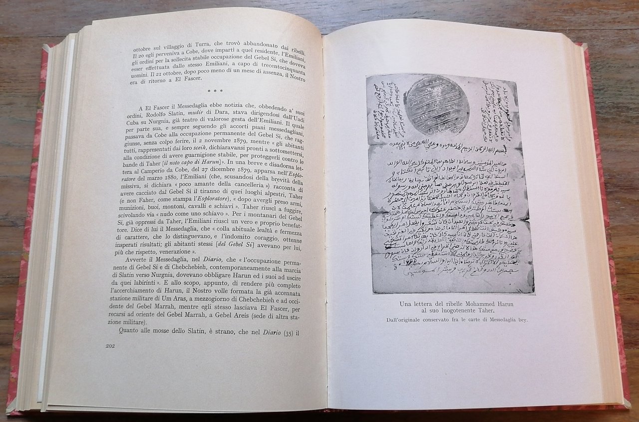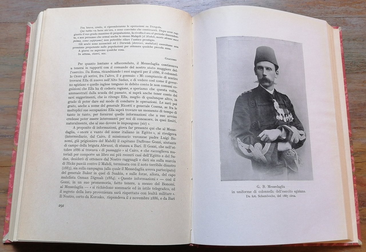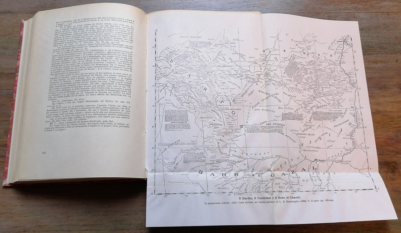 (Giacomo Bartolomeo Messedaglia; Egitto; Sudan; Darfur - Romolo Gessi; Gordon Charles George; Guerra madhista; Eritrea) In 8°, legatura in mezza pelle rossa, al dorso titoli e filetti impressi in oro, carta marmorizzata ai piatti, pp. X,(2),345,(1), con carte ripiegate, tavole fuori testo e numerosi documenti inediti. Prefazione di Luigi Federzoni. "Collezione di opere e di monografie a cura del Ministero delle Colonie" N. 19. Ottimo stato di conservazione.