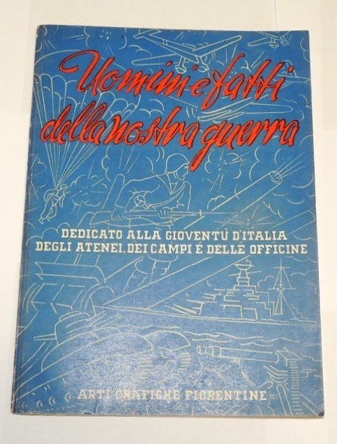 Uomini e fatti della nostra guerra. Dedicato alla gioventù d'Italia degli atenei, dei campi e delle officine, Arti Grafiche Fiorentine, s.l. s.d. (194?), pp. 101, ill. b.n., cm 24, br. ed. Opuscolo di propaganda estremamente raro.