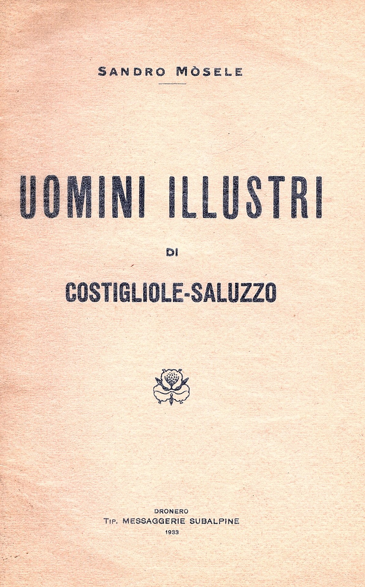 In-8°, pp. 85, (3), brossura editoriale con titolo e fregio déco in nero al piatto anteriore. 6 tavole fotografiche b/n f/t. Ottimo esemplare entro velina. Prima edizione. Raccolta di biografie di uomini illustri nativi di Costigliole di Saluzzo.