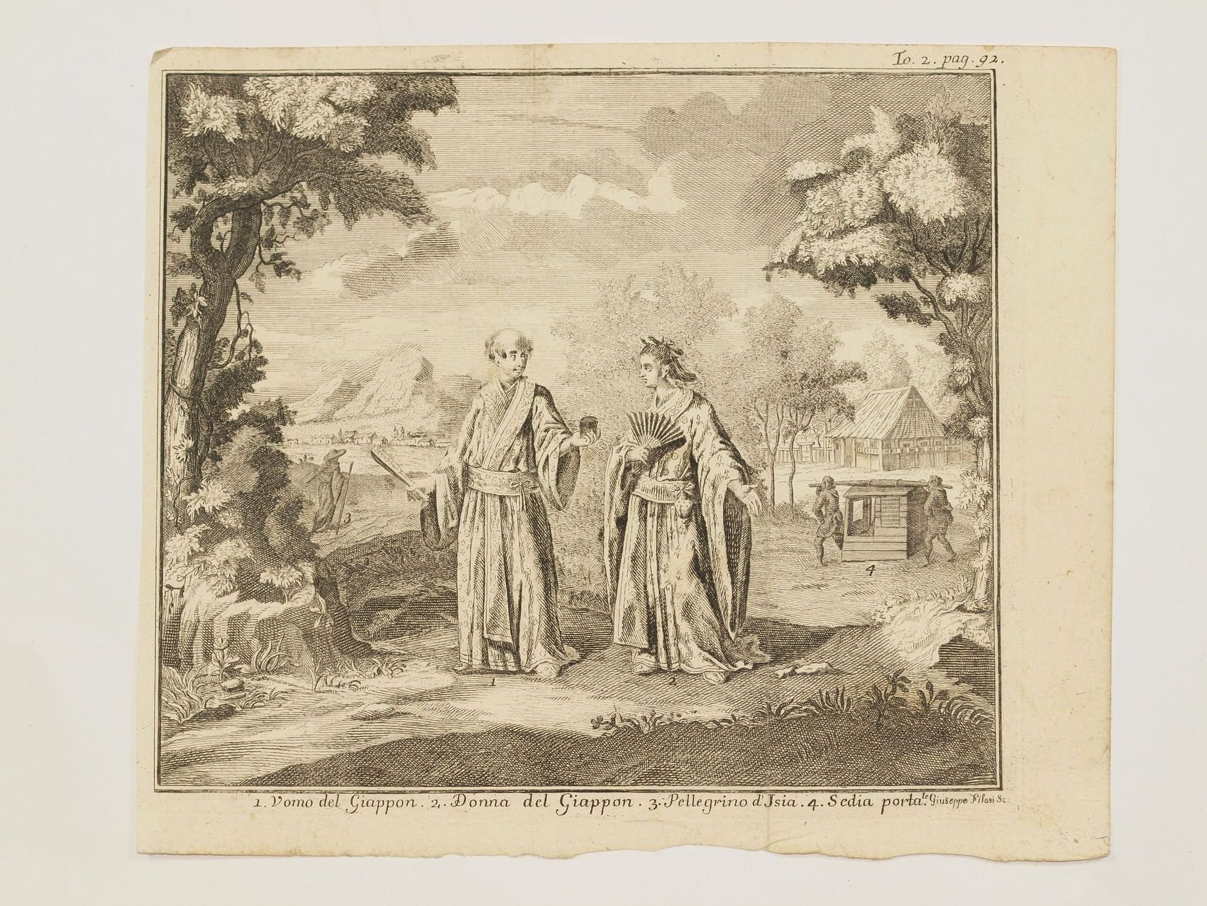 Incisione del 1750 circa che mostra una donna e un uomo giapponese in un bosco Autore: Giuseppe Pilosi Atlas: Lo stato presente di tutti i popoli del mondo 1737-50 Data: 1750 circa Tecnica: acquaforte Dimensioni della pagina: 18,5x22 cm Dimensioni dell'incisione: 16,5x19,5 cm Condizioni: Buone. Alcune fioriture. Print representing a scene showing a Japanese man and woman. Author: Giuseppe Pilosi Atlas: Lo stato presente di tutti i popoli del mondo 1737-50 Date: 1750 circa Technique: Copper etching Leaf Dimension: 18,5x22 cm (7.3x8.7 inches) Engraving Dimension: 16,5x19,5 cm (6.5x7.7 inches) Conditions: Good conditions. Some foxings.