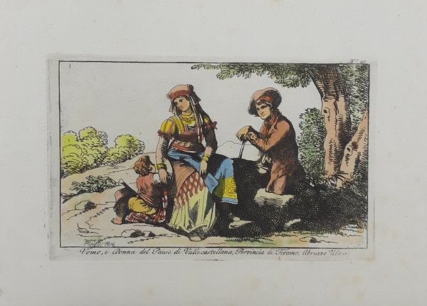 Uomo, e donna del Paese di Valle Castellana, Provincia di Teramo, Abruzzo Ultra. Incisione in rame finemente acquerellata a mano. PINELLI, 1816.