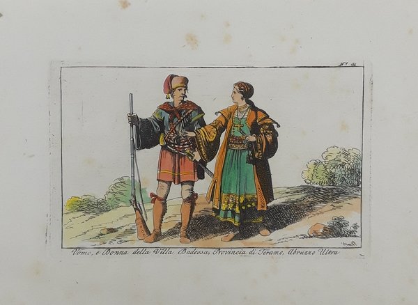 Uomo, e donna della Villa Badessa, Provincia di Teramo, Abruzzo Ultra. Incisione in rame finemente acquerellata a mano. PINELLI, 1816.
