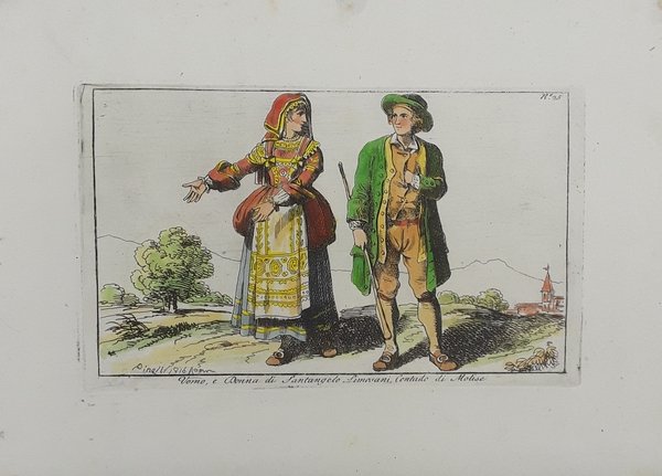 Uomo e donna di Santangelo Limosani, Contado di Molise. Incisione in rame finemente acquerellata a mano. PINELLI, 1816.