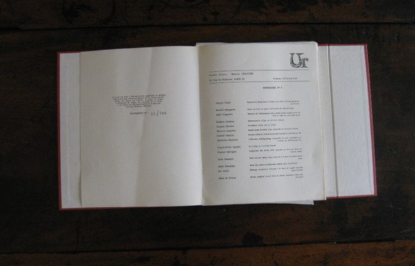Paris, printemps 1965. Direttore fondatore MAURICE LEMAITRE. In -4, con 14 opere grafiche originali, tutte firmate e giustificate di GELPE, HASEGAWA, GAGNAIRE, STUDENY, GAULME, LEMAITRE, SABATIER, HACHETTE, QUEMY, SPACAGNA, JESSEMIN, TEMBLAY, ADAM, DE LATOUR. Rivista fondamentale per la storia del LETTRISMO, che si propone di offrire un insieme di opere d'arte originali (collages, acqueforti, litografie, gouaches, inchiostri di china, etc.) che hanno per tema la LETTERA e il SEGNO. Camicia a risvolti rossa con disegno di Micheline Hachette. Scatola. Tiratura di 100 esemplari numerati (il nostro n. 36). Ottimo.