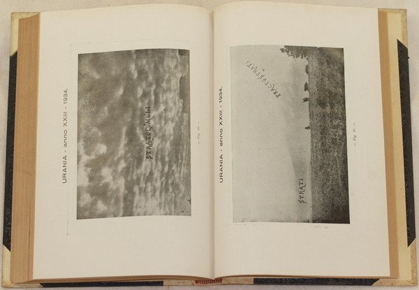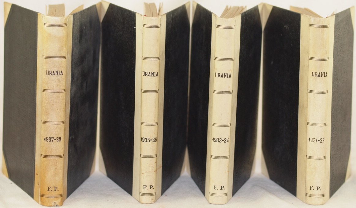 In 8. Dim. 24x17,5 cm. Pp. 48+214+238, 40+227+232, 196+224, 278+206. Kg. 3,00 Bella raccolta di otto annate dal 1931 al 1938 della rivista scientifica bimestrale "Urania" con notizie di astronomia, metereologia, geologia, mineralogia, chimica e fisica Tra gli articoli presenti: Dal sistema solare all'Universo Siderale, notiziario di astronomia, Marte 1659-1929, La meteorologia, Geologia, Dagli atomi agli astri, Notiziario di mineralogia, Elettricità ed energia, Elettroni ed elettricità, Maree terremoti e macchie solari, I raggi ultravioletti, La conoscenza dell'universo, Trattato di astronomia siderale (parte III stelle) di Giuseppe Armellini, Cos'è l'elettricità, Etere ed elettroni, Le nuove ricerche sull'età dell'Universo, Macchie solari, La moderna mineralogia nel quadro delle scienze fisiche chimiche e geologiche, I metalli negli Esseri viventi, L'ottica e l'astronomia, L'astronomia stellare prima del secolo XIX, Galvani la rana la radio, Fantasticando sulle origini dell'Universo, Influenze sulle macchie solari sulla Terra, Elettrizzazioni e radiazioni del corpo umano ecc. Qualche illustrazioni e planches all'interno tra cui la fotografia della Cometa di Halley eseeguite nell'Osservatorio Cerulli in Teramo Brossura di ogni primo numero conservata all'interno. In buone condizioni e completi Copertina in mezza tela con titolo al dorso in buone condizioni generali con lievi usure ai margini e dorso. Dorso dell'annata 1937-38 quasi del tutto staccata. Legatura in buone condizioni con lievo rotture. All'interno le pagine si presentano in buone condizioni con rare fioriture. Beautiful collection of eight years of the scientiphic bemonthly magazine "Urania" from the year 1931 until 1938. The magazine contained information of astronomy, metereology, geology, mineralogy, chemistry and physics. Between the articles inside: From solar system to Sideral Universe, information of astronomy, Mars 1659-1929, Meteorology, Geology, From atoms to stars, Information of mineralogy, Electricity and energy, Electricity, Earthquakes and sun stains, Ultraviolet rays, Knowledge of Universe, Treaty of sideral astronomy (part III stars) by Giuseppe Armellini, What electricity is, Electrons, The new researches about age of universe, Sun stains, Modern mineralogy in the frame of physical, chemical and geological sciences, The metals of beings, Optic and astronomy, Star astronomy before XIX century, Galvani the frog the radio, Wondering about the origins of universe, Influences about sun stains of earth, Radiations of human bodies ecc. Some illustrations and planches inside between them the Star of Halley made in Cerulli Observatory in Teramo. Editorial cover of each first number preserved inside. In good conditions and complete. Half cloth cover with title in the spine in good general conditions slightly worn in the edges and spine. SPine of the year 1937-38 almost totally detached. Binding in good conditions with slight cracks. Inside pages are in good conditions with occasional foxings.