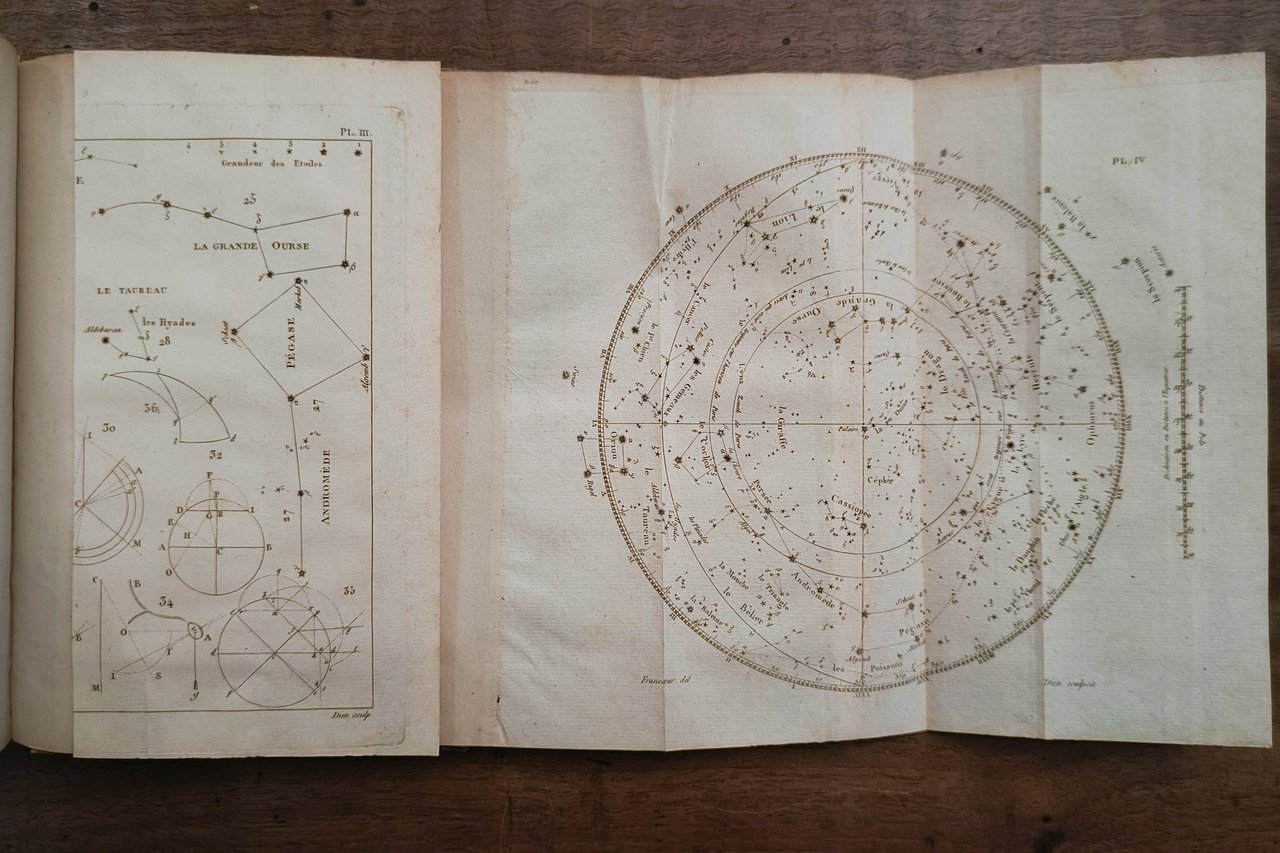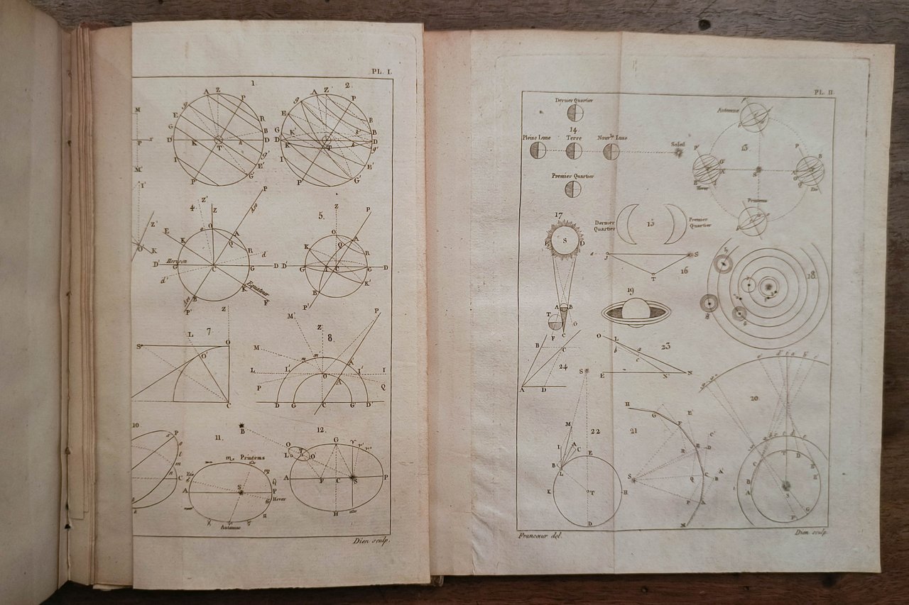 Cm 19,6. Pp. XVI, 316 (2). 9 tavole ripiegate con evoluzione dei pianeti e carte celesti. Legatura in mezza pelle con autore e titolo in oro al dorso.