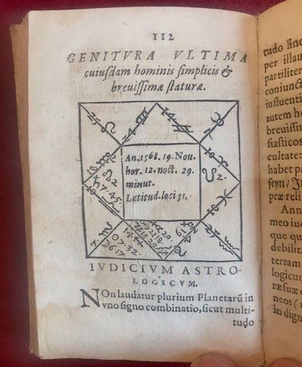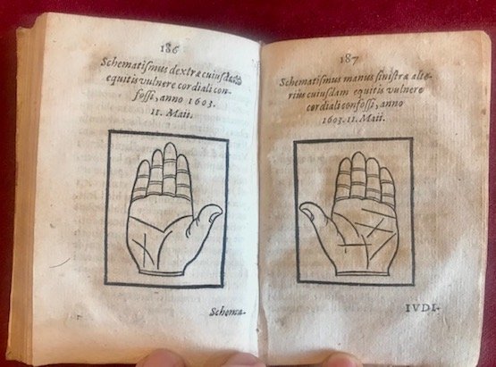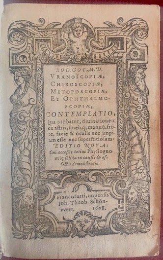 16mo (cm. 12), 290 pp. Num.se illlustrazioni xilografiche raffiguranti oroscopi e mani n.t. Frontespizio entro ricca cornice tipografica. Legatura coeva in pergamena floscia con titoli (non leggibili) ms. al ds. Piccola mancanza alle carte di guardia anteriori. Lieve alone che interessa la parte inferiore di molte carte. Nel complesso esemplare assai genuino ed in ottimo stato di conservazione. Raro.Cfr. Caillet (II, 4616): ‘Cet ouvrage, accompagnéde figures explicatives, est du fameux medecin-physicien-theologien Goclenius, qui propagea les doctrines de Paracelse, et fut renvoyé de l’Ordre de Jesuites pour avoir consulté la Voisin (n.d.r. Una famosa strega di Parigi)’; Cantamessa (Biblioastrology, n. 3152): ‘Testo didattico, di astronomia, astrologia, chiromanzia e metoposcopia. La parte dedicata all’astrologia (prevalente nel testo) è riccamente motivata, come emerge dalle numerose incisioni.’.