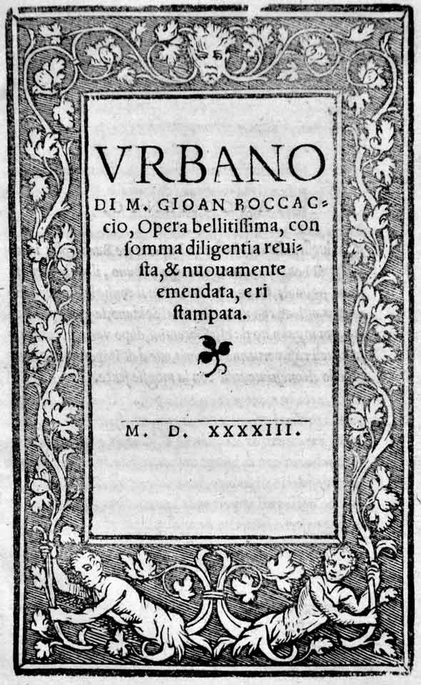 In-16 p. (mm. 153x101), p. pelle ottocentesca con eleganti decorazioni e cornici a secco ai piatti, dorso a cordoni, tagli rossi, 28 cc.nn. (l'ultima è bianca), compreso il bel frontespizio in cornice silografica. Cfr. Brunet,I,1011 che cita varie edizioni di questo petit roman qui, selon l'Académie de la Crusca, est mal à propos attribué à Boccace - Sander,I,1098 - Gamba,1053 per altre edizioni, non la nostra - Bacchi della Lega Opere di Boccaccio, pp. 135-136: L'Urbano, anziché del Boccaccio, si vuole (tra gli altri dal Poggiali) sia lavoro di Giovanni de' Bonsignori da Città di Castello, volgarizzatore delle Metamorfosi d'Ovidio', che ne avrebbe preso l'argomento dal "Libro Imperiale" di un Cambio di Stefano, suo compatriotta, non altro scambiando che i nomi di diversi personaggi introdotti. Al contrario, secondo lo Zambrini, Cambio di Stefano sarebbe il vero autore dell'Urbano (trasformazione del Libro Imperiale').Esemplare ben conservato.