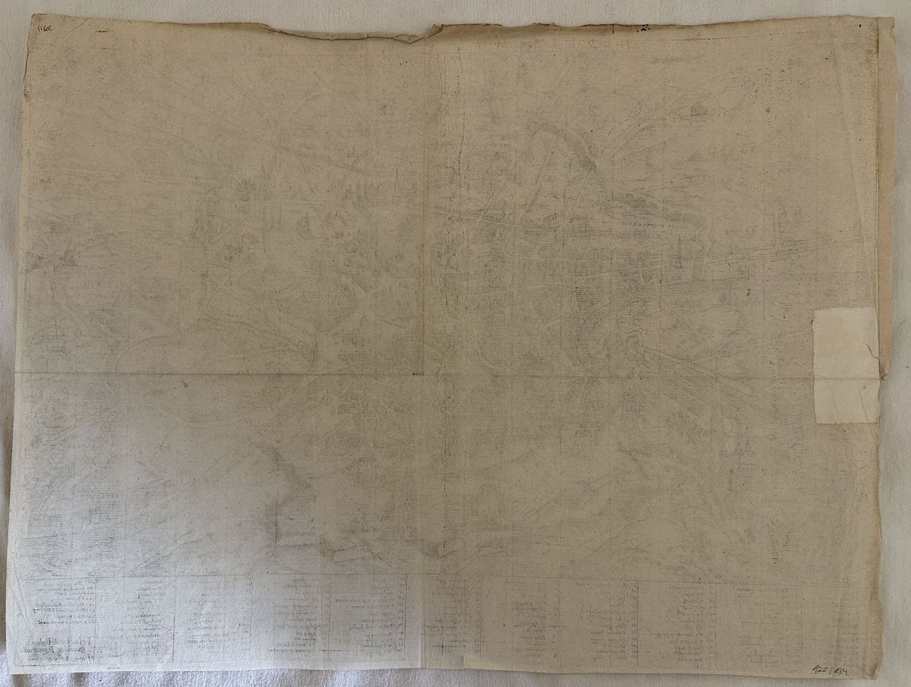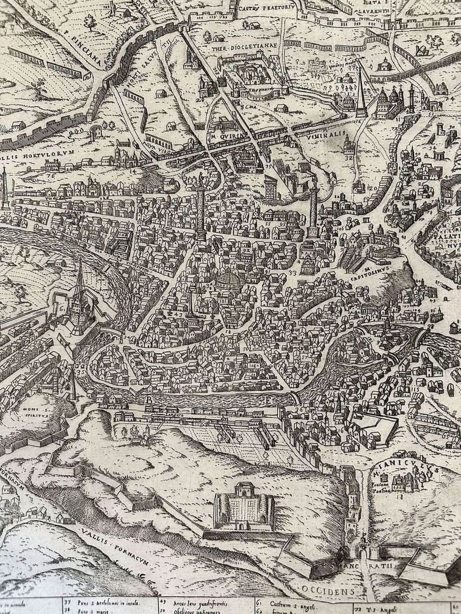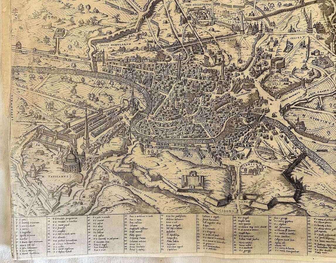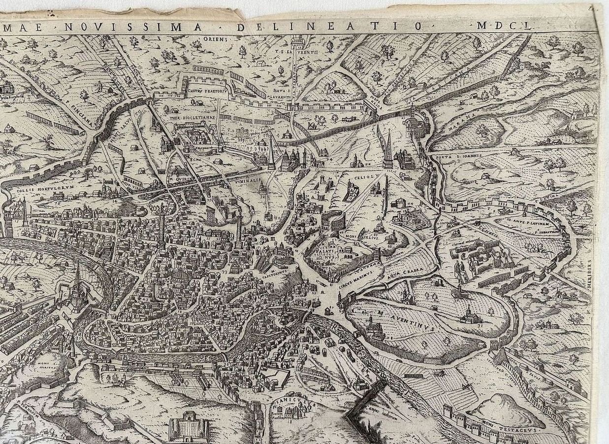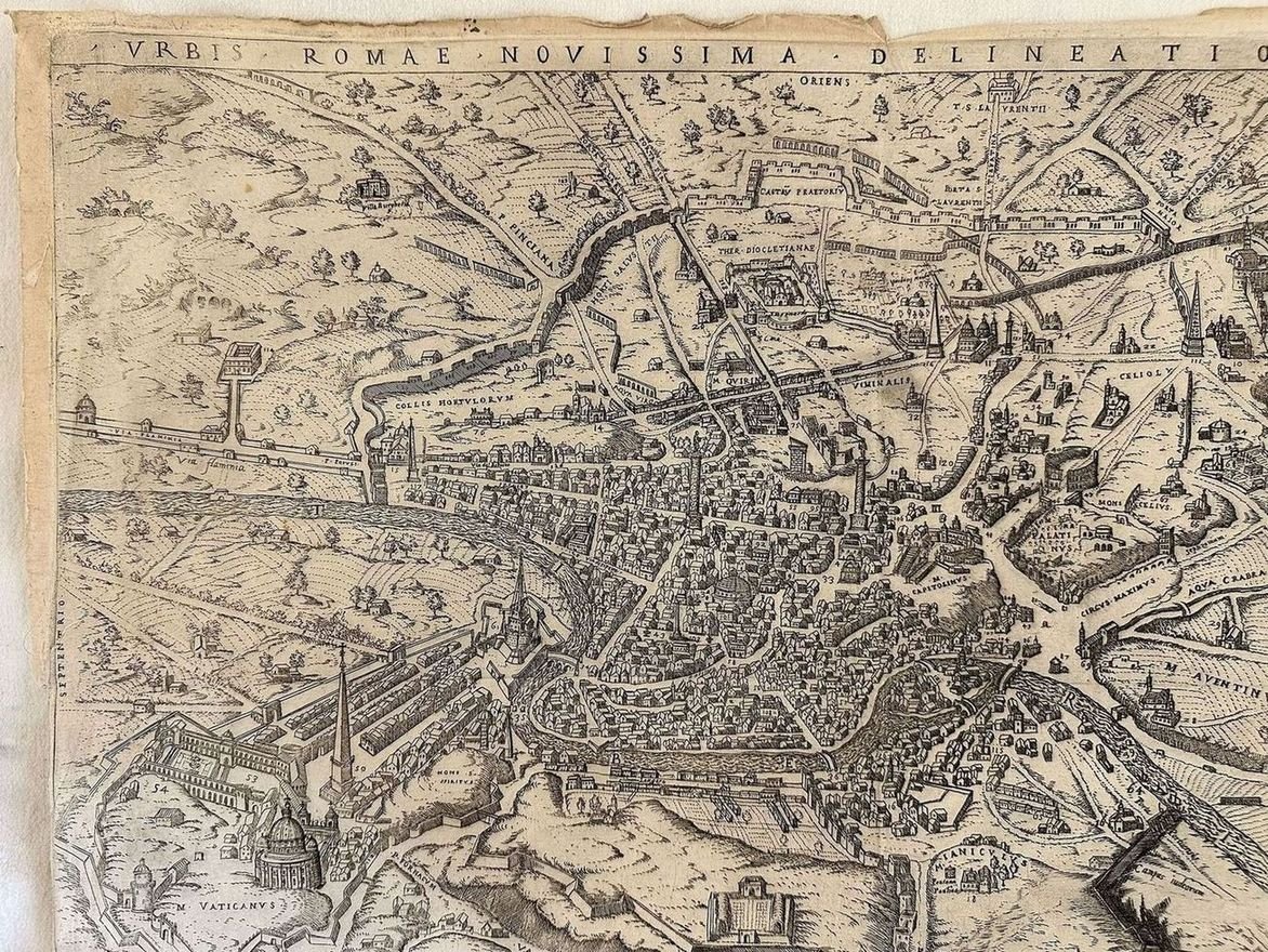 Mappa originale del 1650 della città di Roma. Molto particolareggiata le zone sono contrassegnate da numeri che rimandano a una legenda al margine inferiore per un totale di 128 luoghi. Orientazione ai quattro lati: Oriens, Meridies, Occidens, Septembrio. "Pianta prospettica della città dal Gianicolo, basata sul modello della pianta piccola del Cartaro (1575). il cui unico esemplare conosciuto della prima edizione, a firma de Cavalleris e con data 1589, è conservato nella Biblioteca Nazionale di Malta. Esemplare di quarto stato, con data nel titolo MDL e imprint Io. Iacobus de Rubeis excudebat Romae ad Pacem 1650. Legenda di 128 rimandi. L'opera viene attribuita per la prima volta a Giovan Battista de Cavalleris" (Cfr. S. Bifolco-F. Ronca, Cartografia e topografia italiana del XVI secolo. Catalogo ragionato delle opere a stampa, 2018). Mappa importante dal punto di vista storico in quanto riporta le modifiche urbanistiche introdotte da Papa Sisto V. INCISIONE: Acquaforte e bulino AUTORE: Giuseppe De Rossi DIMENSIONI FOGLIO: cm 23x26 DIMENSIONI INCISIONE: cm 9x12 EPOCA: 1650 CONDIZIONI: buone condizioni. Lievi usure marginali. Piegature. Strappo orizzontale di 4 cm restaurato. Original map of 1650 of the city of Rome. The map is rich of details and the areas are numbered and addressed to a legend with 128 places. Orientation to four sides: Oriens, Meridies, Occidens, Septembrio. "Pianta prospettica della città dal Gianicolo, basata sul modello della pianta piccola del Cartaro (1575). il cui unico esemplare conosciuto della prima edizione, a firma de Cavalleris e con data 1589, è conservato nella Biblioteca Nazionale di Malta. Esemplare di quarto stato, con data nel titolo MDL e imprint Io. Iacobus de Rubeis excudebat Romae ad Pacem 1650. Legenda di 128 rimandi. L'opera viene attribuita per la prima volta a Giovan Battista de Cavalleris" (Cfr. S. Bifolco-F. Ronca, Cartografia e topografia italiana del XVI secolo. Catalogo ragionato delle opere a stampa, 2018). A really important map from an historical point of view because it introduces the urban variation of thePope Sisto V. ENGRAVING: Burin etching AUTHOR: Giuseppe De Rossi SIZE OF PAGE: cm 54,5x41,5 SIZE OF THE ENGRAVING: cm 40x53 PERIOD: 1650 CONDITIONS: good conditions. Light wearings in the edges. Foldings. Tear of 4 cm has been restored.