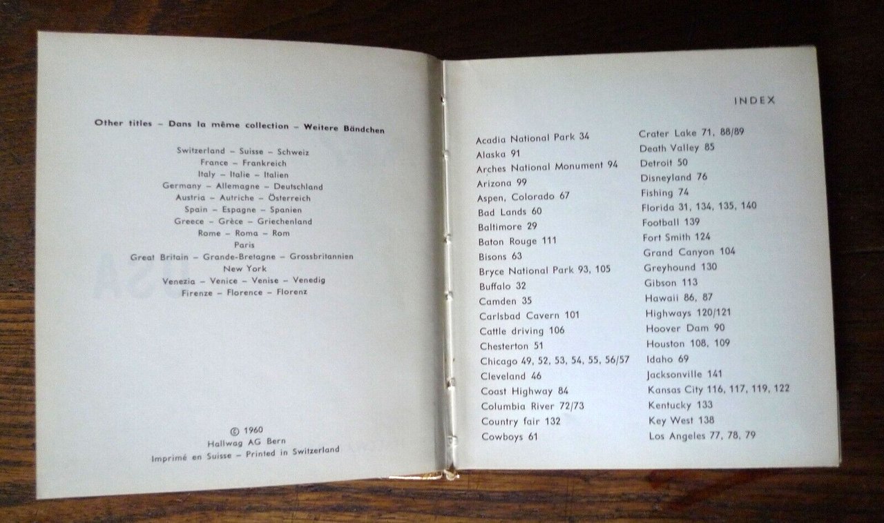 USAHallwag Ag Bern (Svizzera) 1960.,copertina rigida, 12x10,5 cm., pp.143,completamente illsutrato con fotografie in bianco e nero,con 2 mappe a colori degli Stati Unitialle carte di guardia,peso: g.200