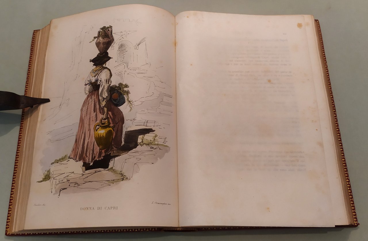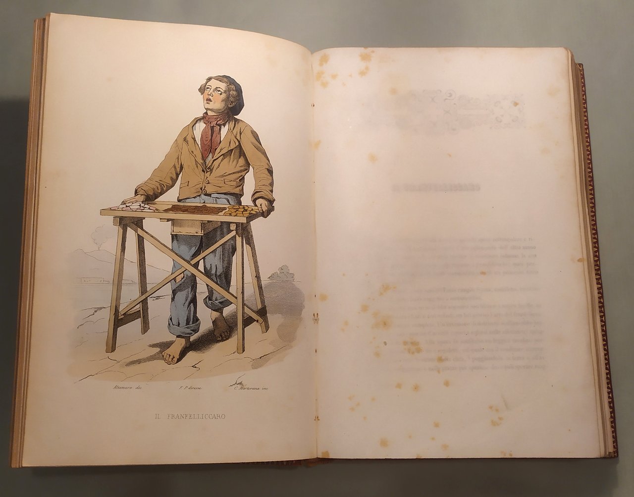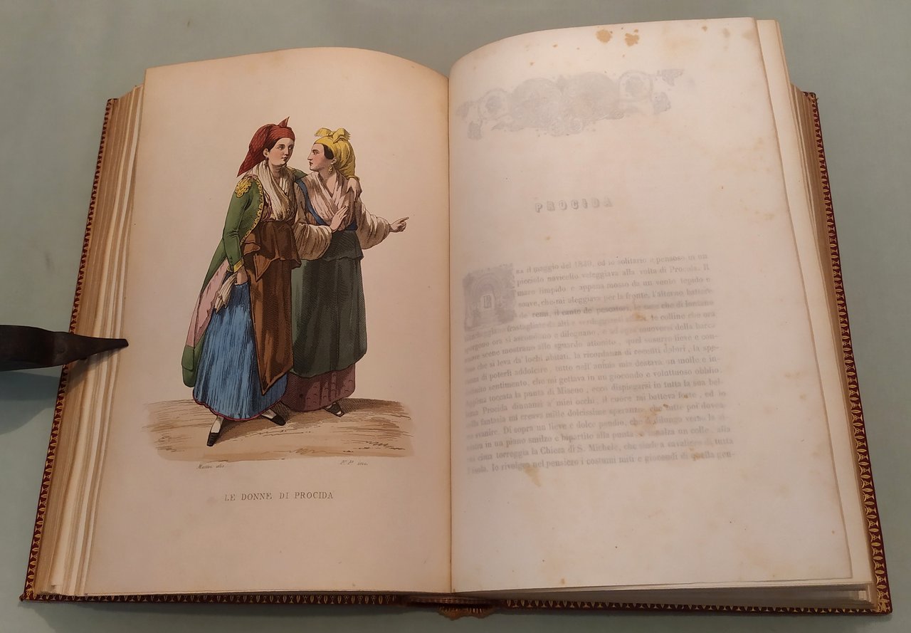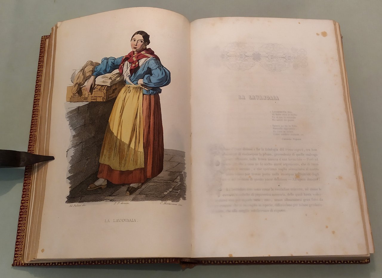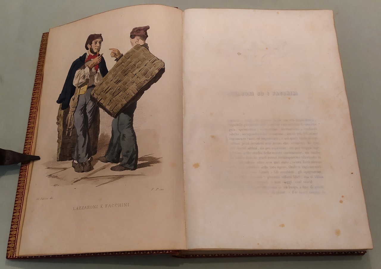 Napoli, Gaetano Nobile, 1853-1858. In 8vo; pp.XIX,324;340. 100 tavole con splendida coloritura coeva tratte dai disegni di Palizzi, Duclere, Altamura, Martorana e Mattei. Il testo a cura di Bideri, Mastriani, De Lauzieres, Dalboni ed altri. Firma autografa dell’autore ad entrambi i volumi. Bella legatura in pelle rossa, losanghe ai piatti con fregi a colori ed in oro, dorsi a cordoni con titolo e ricchi fregi in oro; dentelles. Un documento unico ed assai raro per la conoscenza del popolo napoletano. Colas 411; Lipperheide 1304; Vinet 2308.