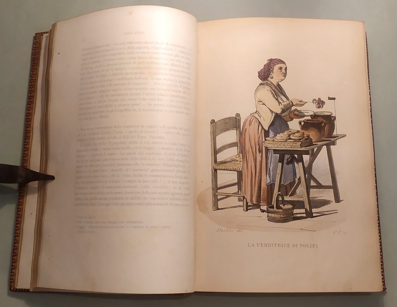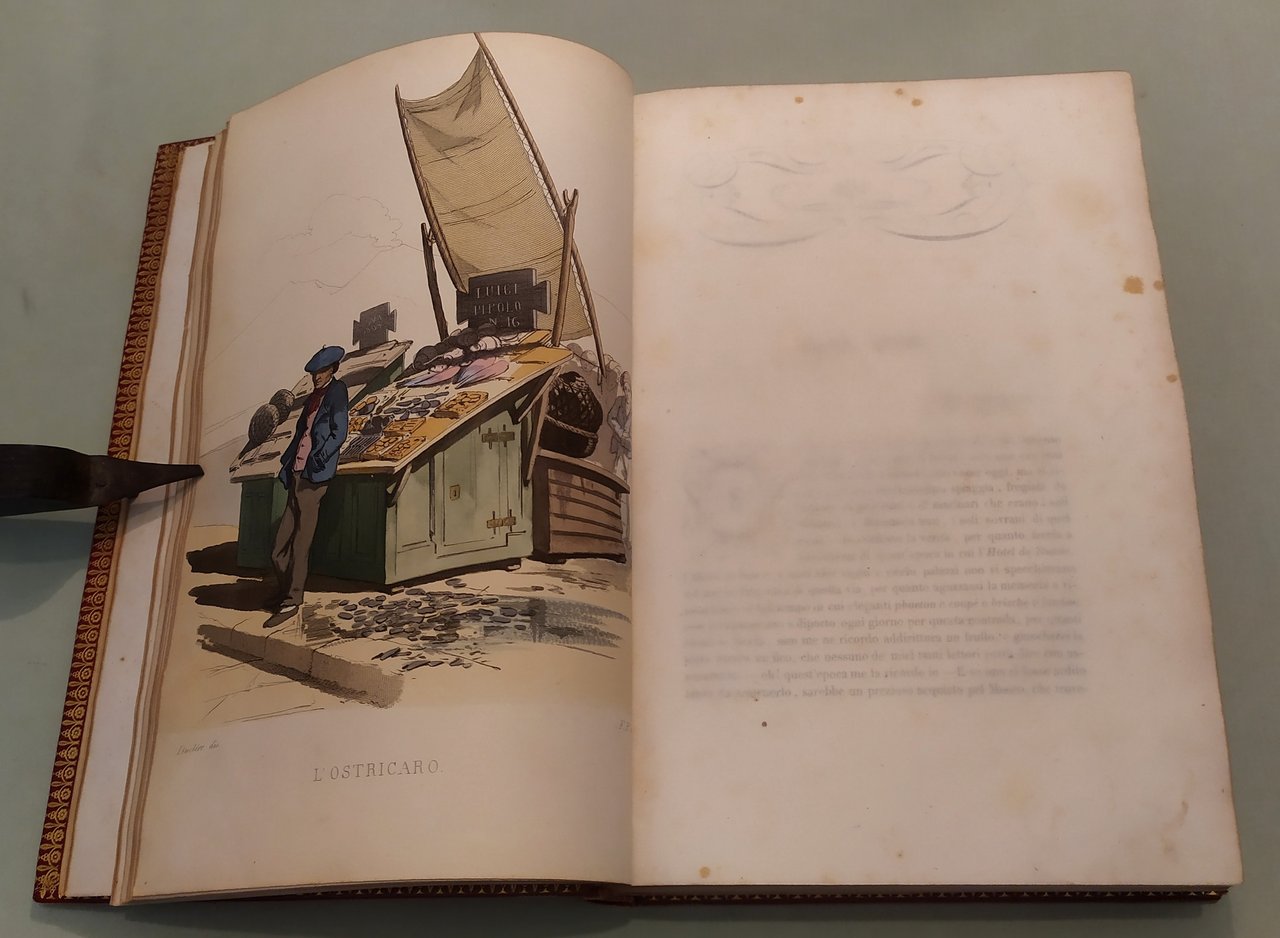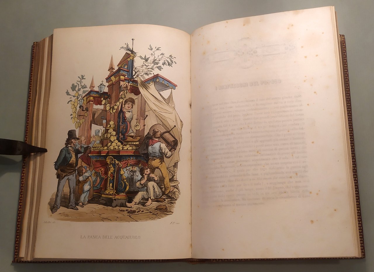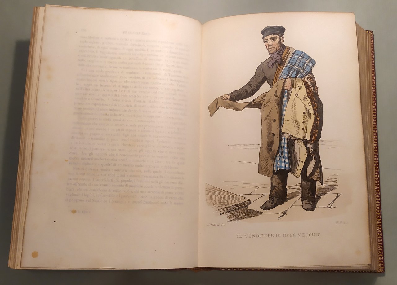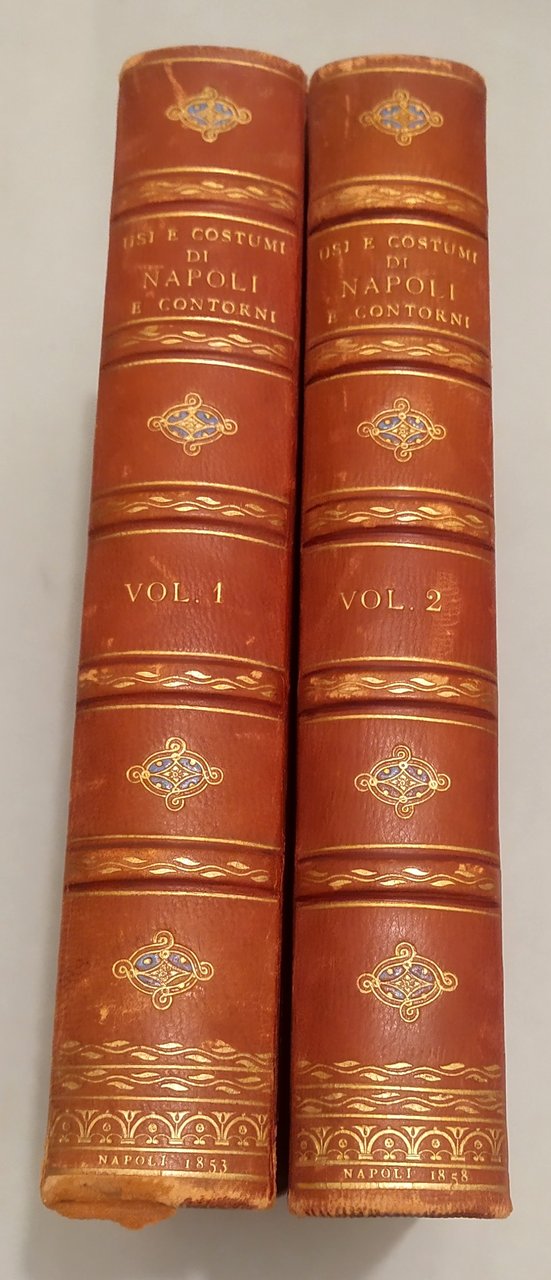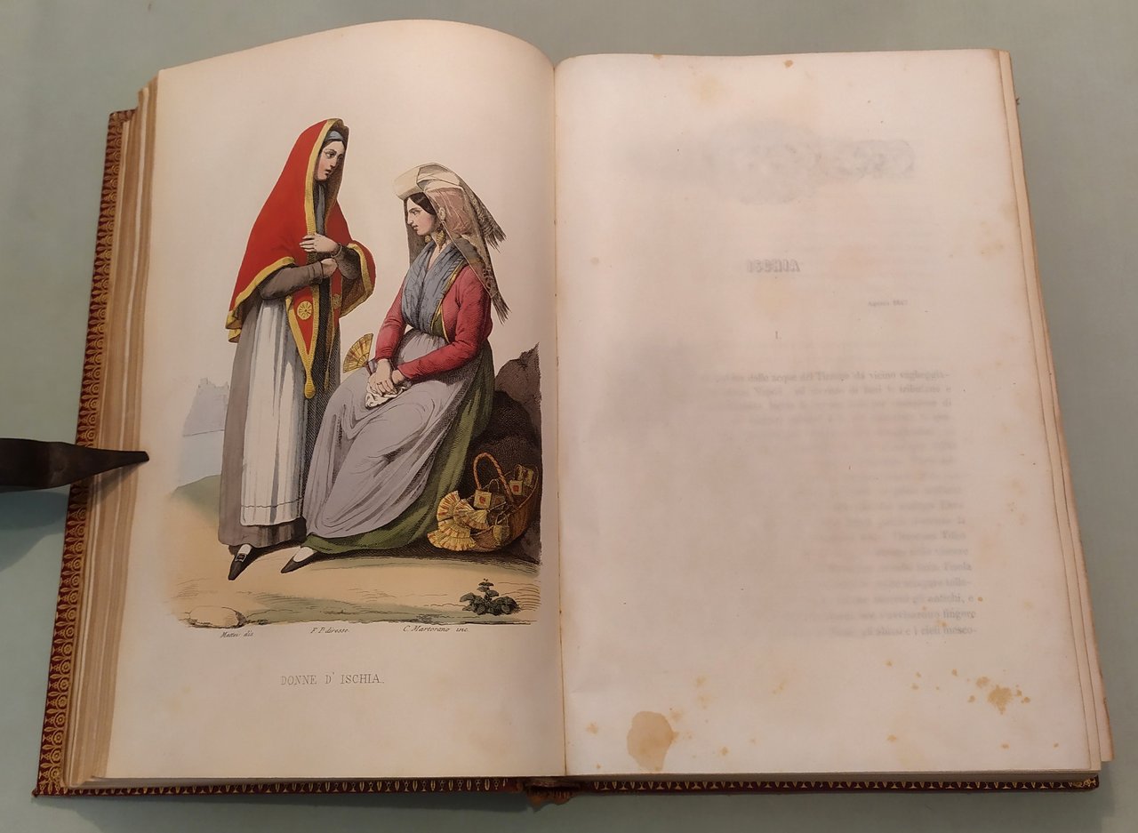 Napoli, Gaetano Nobile, 1853-1858. In 8vo; pp.XIX,324;340. 100 tavole con splendida coloritura coeva tratte dai disegni di Palizzi, Duclere, Altamura, Martorana e Mattei. Il testo a cura di Bideri, Mastriani, De Lauzieres, Dalboni ed altri. Firma autografa dell’autore ad entrambi i volumi. Bella legatura in pelle rossa, losanghe ai piatti con fregi a colori ed in oro, dorsi a cordoni con titolo e ricchi fregi in oro; dentelles. Un documento unico ed assai raro per la conoscenza del popolo napoletano. Colas 411; Lipperheide 1304; Vinet 2308.