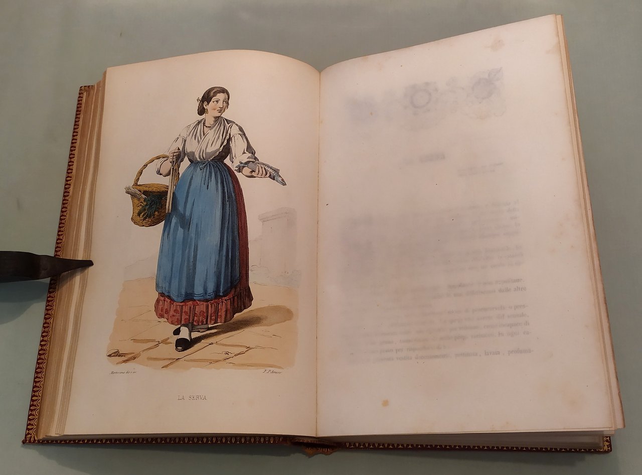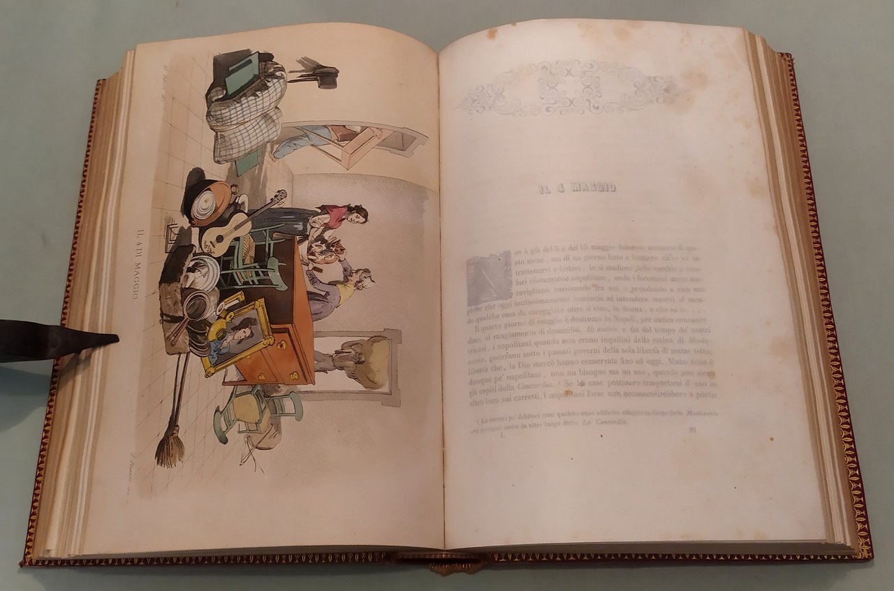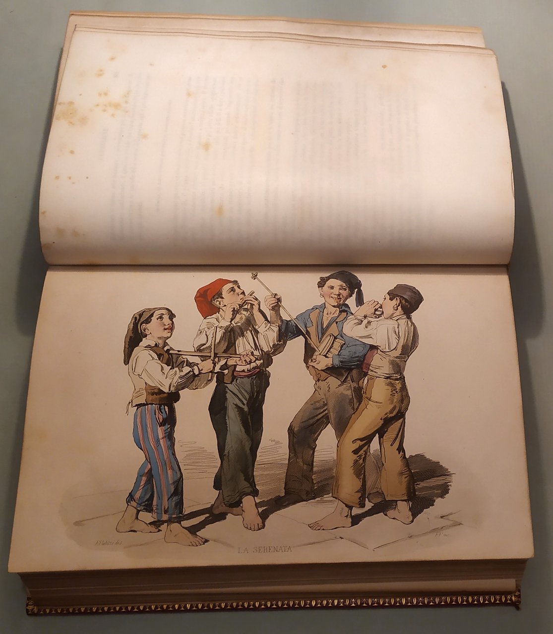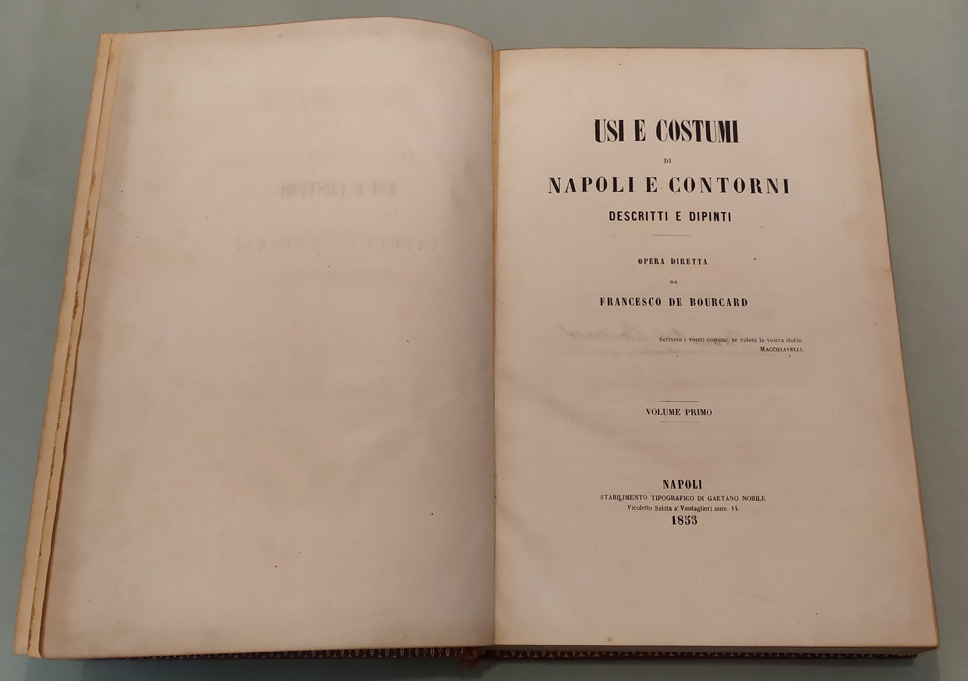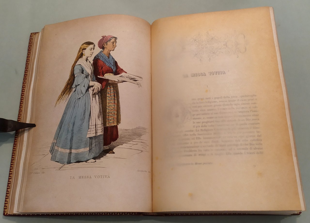 Napoli, Gaetano Nobile, 1853-1858. In 8vo; pp.XIX,324;340. 100 tavole con splendida coloritura coeva tratte dai disegni di Palizzi, Duclere, Altamura, Martorana e Mattei. Il testo a cura di Bideri, Mastriani, De Lauzieres, Dalboni ed altri. Firma autografa dell’autore ad entrambi i volumi. Bella legatura in pelle rossa, losanghe ai piatti con fregi a colori ed in oro, dorsi a cordoni con titolo e ricchi fregi in oro; dentelles. Un documento unico ed assai raro per la conoscenza del popolo napoletano. Colas 411; Lipperheide 1304; Vinet 2308.