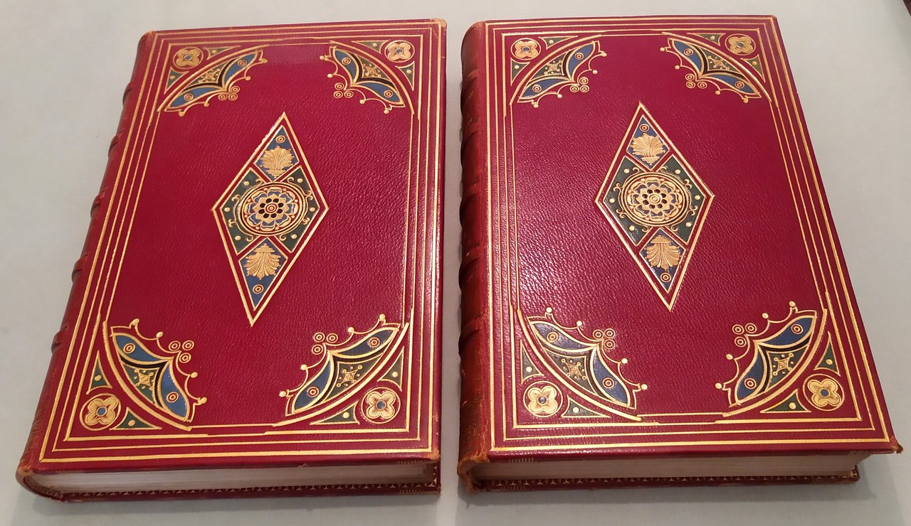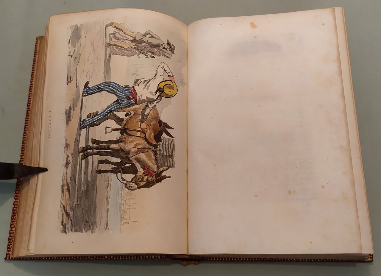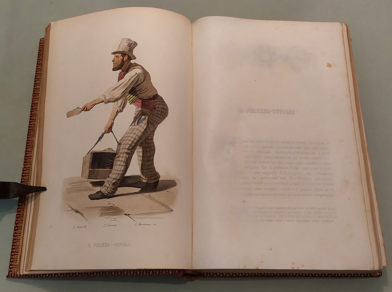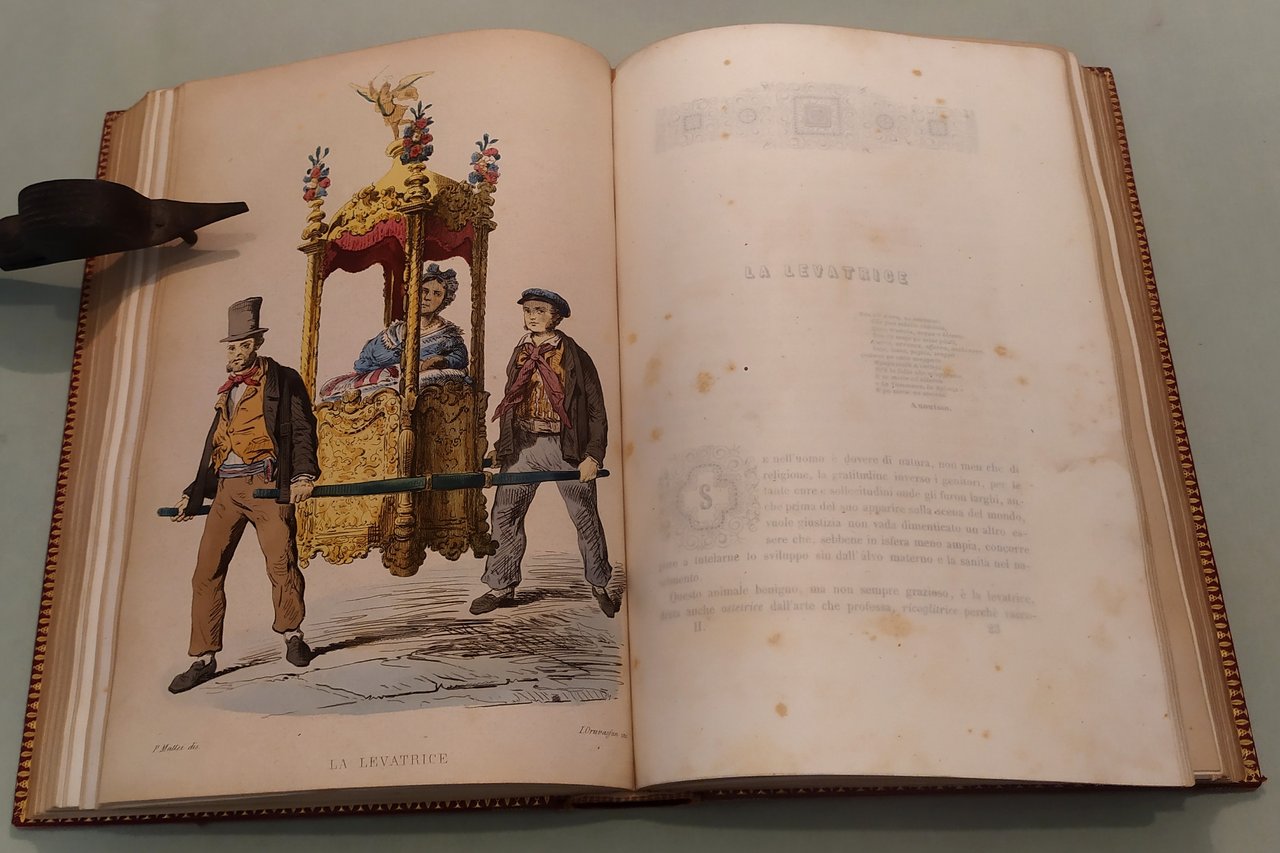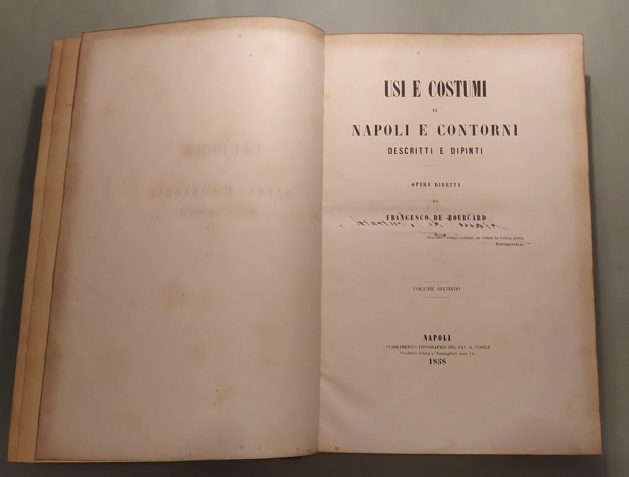 Napoli, Gaetano Nobile, 1853-1858. In 8vo; pp.XIX,324;340. 100 tavole con splendida coloritura coeva tratte dai disegni di Palizzi, Duclere, Altamura, Martorana e Mattei. Il testo a cura di Bideri, Mastriani, De Lauzieres, Dalboni ed altri. Firma autografa dell’autore ad entrambi i volumi. Bella legatura in pelle rossa, losanghe ai piatti con fregi a colori ed in oro, dorsi a cordoni con titolo e ricchi fregi in oro; dentelles. Un documento unico ed assai raro per la conoscenza del popolo napoletano. Colas 411; Lipperheide 1304; Vinet 2308.
