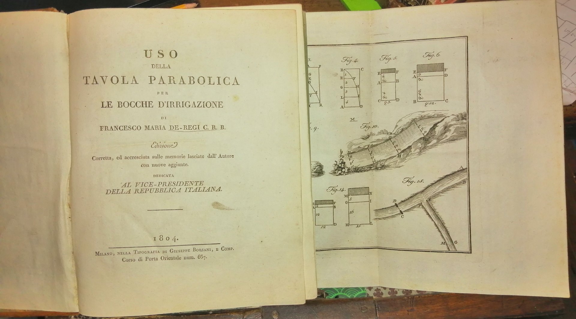 Uso della tavola parabolica per le bocche d'irrigazione di Francesco Maria De Regi c.r.b. Edizione corretta, ed accresciuta sulle memorie lasciate dall'autore con nuove aggiunte. Dedicata al Vice-Presidente della Repubblica italiana
