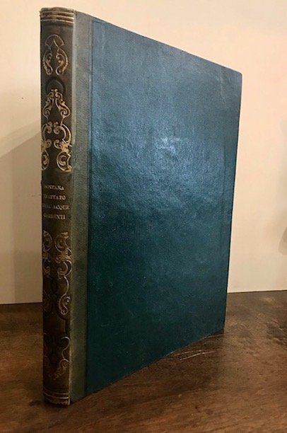 Folio (cm. 32), 8 cc.nn., 196 pp., 6 cc.nn. Con 82 illustrazioni a metà pagina n.t. e 2 tavole ripiegate f.t. (il tutto inciso su rame da Alessandro Specchi su disegni dello stesso Fontana). Marca tipografica in fine (iniziali GFB intrecciate simmetricamente entro cornice vegetale). Capilettera e fregi xilografici. Legatura ‘800 in mz. pelle verde con ricco decoro e titolo impressi in oro al ds. Tagli bleu. Vistoso ma debole alone di sofferta umidità che interessa l’angolo superiore esterno di quasi tutto il volume ma, nel complesso, esemplare genuino ed in più che buono stato di conservazione. Provenienza: collezione Moretti, Roma (timbretto ex libris al frontespizio). Prima edizione. L’opera del Fontana - architetto, allievo e collaboratore del Bernini - è assai apprezzata sia sul piano scientifico sia su quello iconografico: le pregevoli incisioni illustrano infatti soluzioni ingegneristiche ed idrauliche, ma anche fontane e giochi d’acqua di gusto tipicamente barocco. Nella prima parte si descrivono i metodi di convoglio e conduzione dell'acqua attraverso canali e acquedotti; nella seconda ci si sofferma sui sistemi idraulici alla base delle fontane più belle e raffinate.Cicognara, 915; Riccardi I, 466; Fowler, 123 (senza le due tavole rip.); Berlin Katalog, 3613.