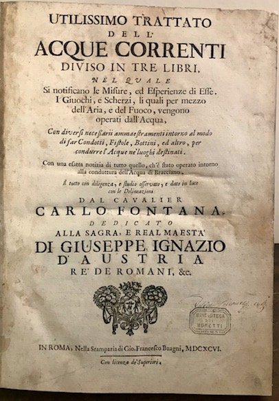 Utilissimo trattato dell’acque correnti diviso in tre Libri, nel quale si notificano le misure, ed esperienze di esse. I giuochi, e scherzi, li quali per mezzo dell’aria, e del fuoco, vengono operati dall’acqua. Con una esatta notizia di tutto quello, ch’è stato operato intorno alla conduttura dell’acqua di Bracciano.