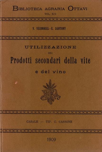 Casale, Tipografia Carlo Cassone, 1909. Biblioteca Agraria Ottavi, vol. XCI. Traduzione con note del Prof. Arturo Marescalchi. In 12esimo, pp. XI (di Indice), 212 + 3 di pubblicità editoriale, bross. edit. in carta marrone con titoli in nero. Alcuni tra gli argomenti: Distillazione, conservazione e uso delle vinacce, vinacce e uva; tartari greggi; residui della distillazione del vino; estrazione del tannino; le melasse; composizione dei tralci; Trinciatura dei sarmenti; composizione della miscela sarmenti e melassa. Buona conservazione.