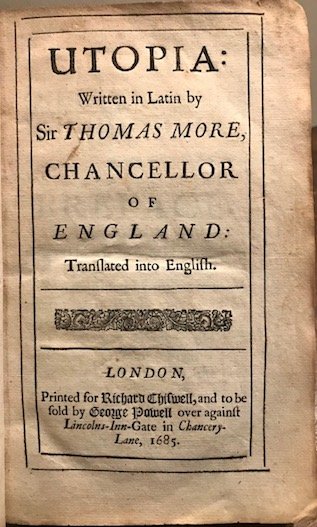 8vo (cm. 17,8), 12 cc.nn., 206 pp., 1 c.nn. bianca. Legatura coeva in piena pelle con titolo ms. su tassello cartaceo al ds. (usurata, con abrasioni e piccole mancanze). Ex libris araldico ‘N. Mac Eacharn. Galloway House, Wigtownshire’ al contropiatto anteriore. Nota di appartenenza seicentesca sulla carta di guardia libera anteriore. Lieve ed uniforme ingiallitura delle pagine ed una piccola mancanza all’angolo superiore della terza carta senza alcuna perdita di testo. Assente la carta di guardia libera posteriore. Buon esemplare nel complesso. Seconda rara edizione della traduzione di Gilbert Burnet della celebre opera di Thomas More che vide la luce in latino nel 1516. Ralph Robinson curò una prima versione in inglese che uscì nel 1551, ma che non rendeva bene l'originale. Dunque la traduzione di Burnet, più esatta, pubblicata per la prima volta nel 1684, divenne rapidamente la versione definitiva del testo. Tutte le edizioni dell'Utopia stampate nel corso del Settecento a Dublino, Glasgow, Edimburgo, Oxford e Londra sono basate sul Burnet.