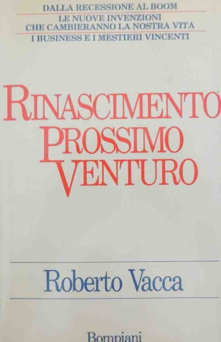 Roberto Vacca, Rinascimento prossimo venturo, Bompiani, Milano 1986, prima ed., pp. 281, cart. ed. con titoli al dorso e sovraccoperta. Lieve brunitura della carta, per il resto perfetto.