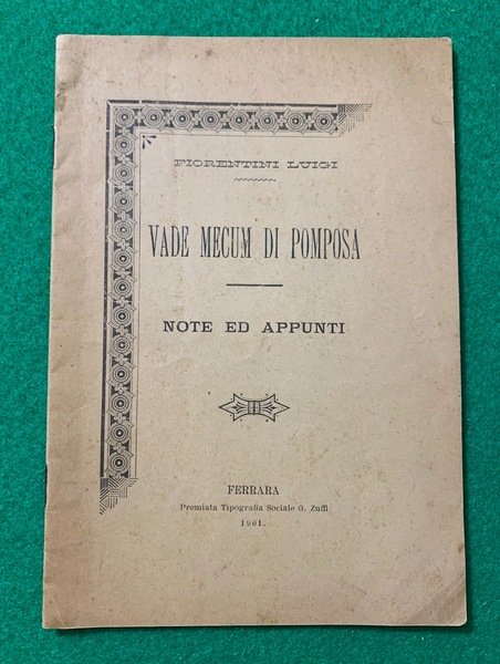 18,5x13 cm; 14, (2 b.) pp. Brossura editoriale con titolo e autore impressi in nero al piatto anteriore che presenta anche una ricca cornice. Prima rara edizione, un solo esemplare censito in ICCU, di questa importante monografia del noto storico ferrarese, dedicato all'Isola di Pomposa "L'insula Pomposiana" ed alla sua celeberrima abazia, posta tra il Po di Goro, il Po di Volano ed il mare.
