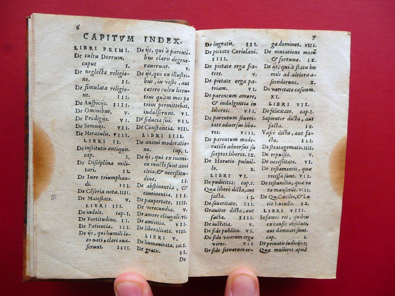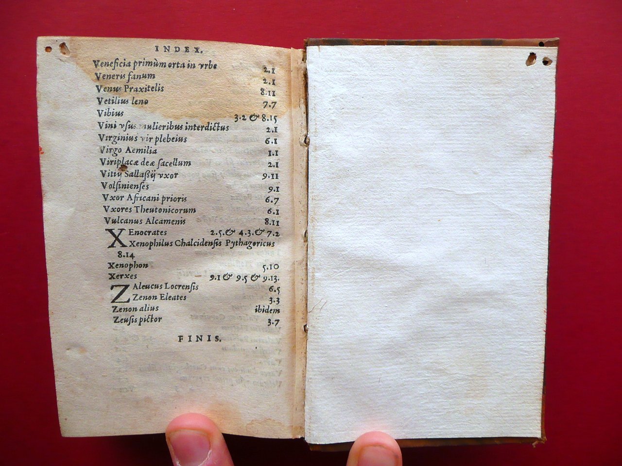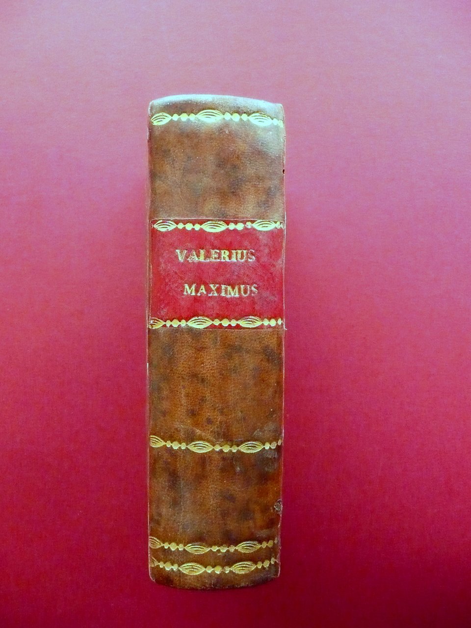 Cinquecentina, Valerii Maximi Collectanea Id est selecta exempla, quibus urbis Romae, exterarumque gentium facta simul ac dicta memoratu digna continentur [.] Apud Antonium Gryphium, Lugduni 1566; cm 12,5x8; pp. 616-[30], con qualche piccola testatina e capilettera incisi in b/n; frontespizio con marca tip. incisa in b/n. Legatura d'epoca in mezza pelle con titolo e fregi impressi in oro al dorso, piatti marmorizzati; tagli colorati a spruzzo. Risguardo ant. con firma del precedente proprietario. Condizioni di conservazione Esemplare in buono stato con tracce d'uso, coperta con qualche piccolo / minimo forellino e mancanza (vedi foto). Interni buoni con alcune piccole lievi bruniture; margini di qualche pagina con piccole leggere ombre di gore che non compromettono il testo. Angolo sup. del risguardo post. e delle pagine d'indice con una minima mancanza che non interessa il testo. Rara cinquecentina realizzata da Antonio Griffo, di piccolo formato. Ben conservata. SETT11.L19136 N P