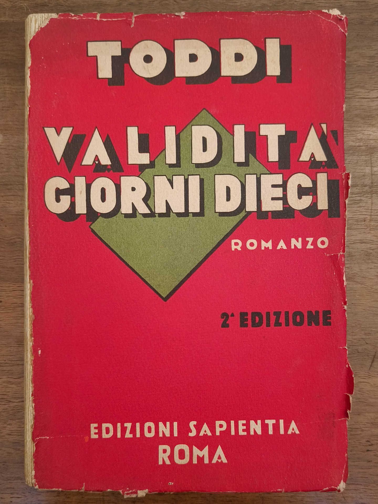 Validità giorni dieci, Roma, Sapientia, 1930. II ed. Cm 19. Pp. 218. Brossura editoriale. Copertina sciupata, mancanza del dorso. Dedica autografa dell'autore "A Giorgio Roncali mecenate del libro Roma Festa del libro 1930 VIII".