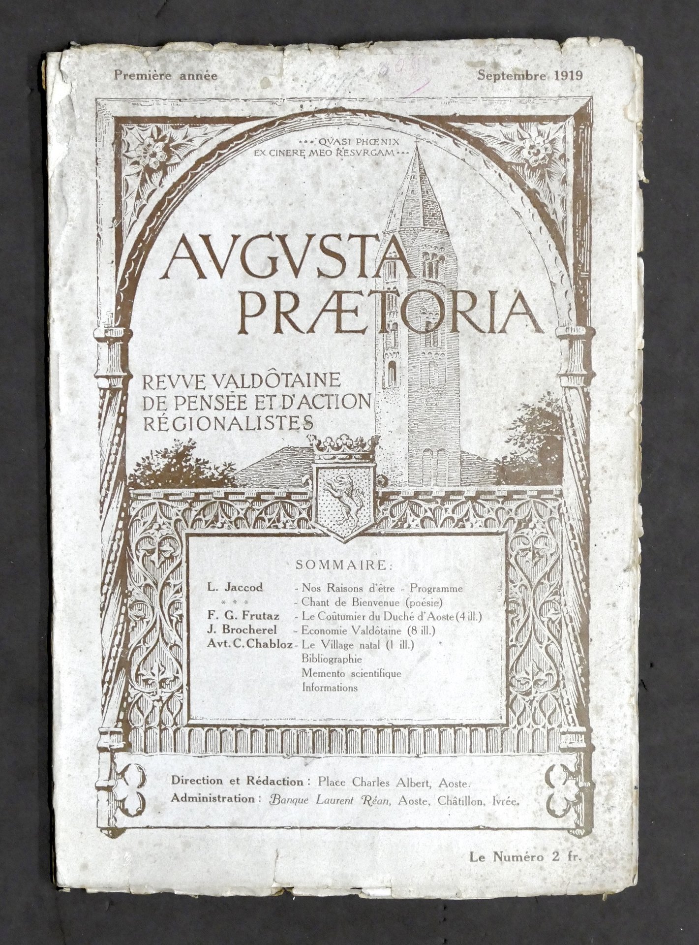 Storia Valle d'Aosta Rivista Augusta Praetoria -  Anno I N° 1 - Settembre 1919 Pag. 64 con alcune illustrazioni. Copertina morbida - Testo in francese. Buone condizioni interne. Qualche mancanza al dorso e alla copertina.