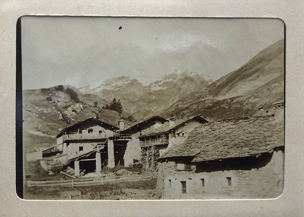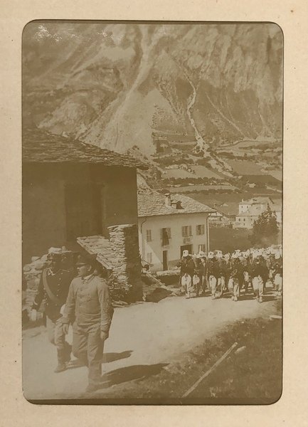 VALLE d'AOSTA. Album fotografico con 96 FOTOGRAFIE all'albumina tra cui una una quarantina con VEDUTE di localtà valdostane (La Thuile, Piccolo San Bernardo, Ghiacciaio della Brenva ecc.), 4 con schiere di MILITARI (Zappatori Alpini in tenuta di marcia) ecc.