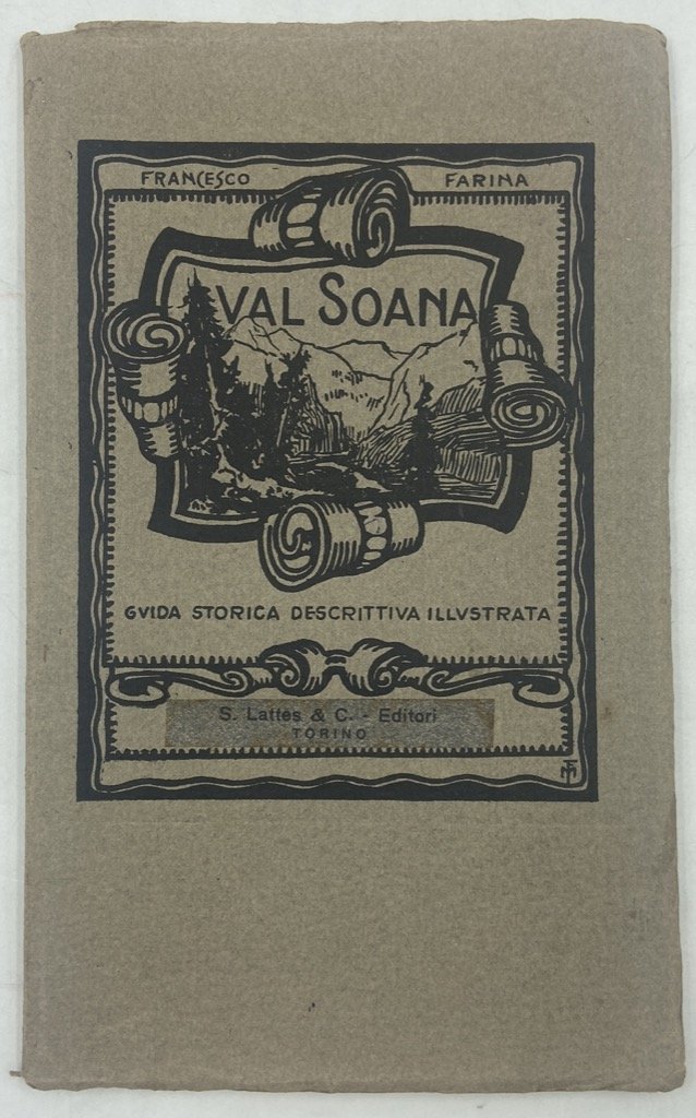 Brossura editoriale illustrata, cm 22x14, pp 127 (1), 57 illustrazioni in nero nel testo, una carta ripiegata in fine. Buon esemplare, lievemente lento di legatura. Pecetta della libreria editrice Lattes sul frontespizio e sul piatto anteriore. Seconda edizione ampliata (la prima fu pubblicata a Ivrea nel 1909 e fu premiata all’Esposizione torinese del 1911) di questa guida della valle canavesana del torrente Soana e dei dintorni, con prefazione di Carlo Toesca di Castellazzo e dedica a stampa agli scolari di Ronco allievi dell’autore caduti durante la Grande Guerra. La guida offre informazioni storiche, artistiche e naturalistiche sulla valle e i suoi borghi (Pont Canavese, Ingria, Ronco Canavese, Valprato, Campiglia), le vie d’accesso, la Strada Reale di Caccia e la conca dell’Azzaria, la Valle Forzo, gli usi, i costumi, le feste e il dialetto locale; l’ultima sezione è dedicata al Parco Nazionale del Gran Paradiso recentemente istituito, alle ascensioni (Punta del Vallone, M. Colombo, M. Cimur, M. Gialin, Grand’Uja di Ciardoney, Punta delle Sengie, M. Veso, Torre di Lavina, Rosa dei Banchi, M. Marzo, M. Goiassa, M. Ghiavino, Cima di Pal, Punta di Verzel, Punta Quinzeina), alle traversate nelle Valli d’Orco, di Cogne, di Champorcher e Chiusella, ai laghi (Lazin, di Canaussa, della Mionda). Numerose fotografie di montagne e ghiacciai, borghi e costumi locali illustrano la guida, la copertina è dell’artista torinese Francesco Mennyey (1889-1950). Esemplare arricchito da un invio autografo dell'autore.