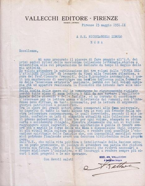 comunicazione firmata dell'editore fiorentino Vallecchi su carta intestata della casa editrice datata Firenze, 15 maggio 1931; buon es.