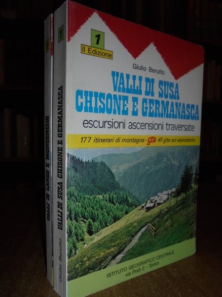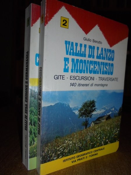 Giulio, Berutto. Torino, Istituto Geografico Centrale, 1980 - 1977. Valli di Susa Chiusone e Germanasca. Escursioni ascensioni traversate. Valli di Lanzo e Moncenisio. Gite - Escursioni - Traversate. 2 volumi in-16°, cartoncino edit. 327 pp. 177 itinerari di montagna; 212, (2) pp. 140 itinerari di montagna. In ottimo stato di conservazione o come nuovi. Neg. geo. viaggi entro busta trasp.