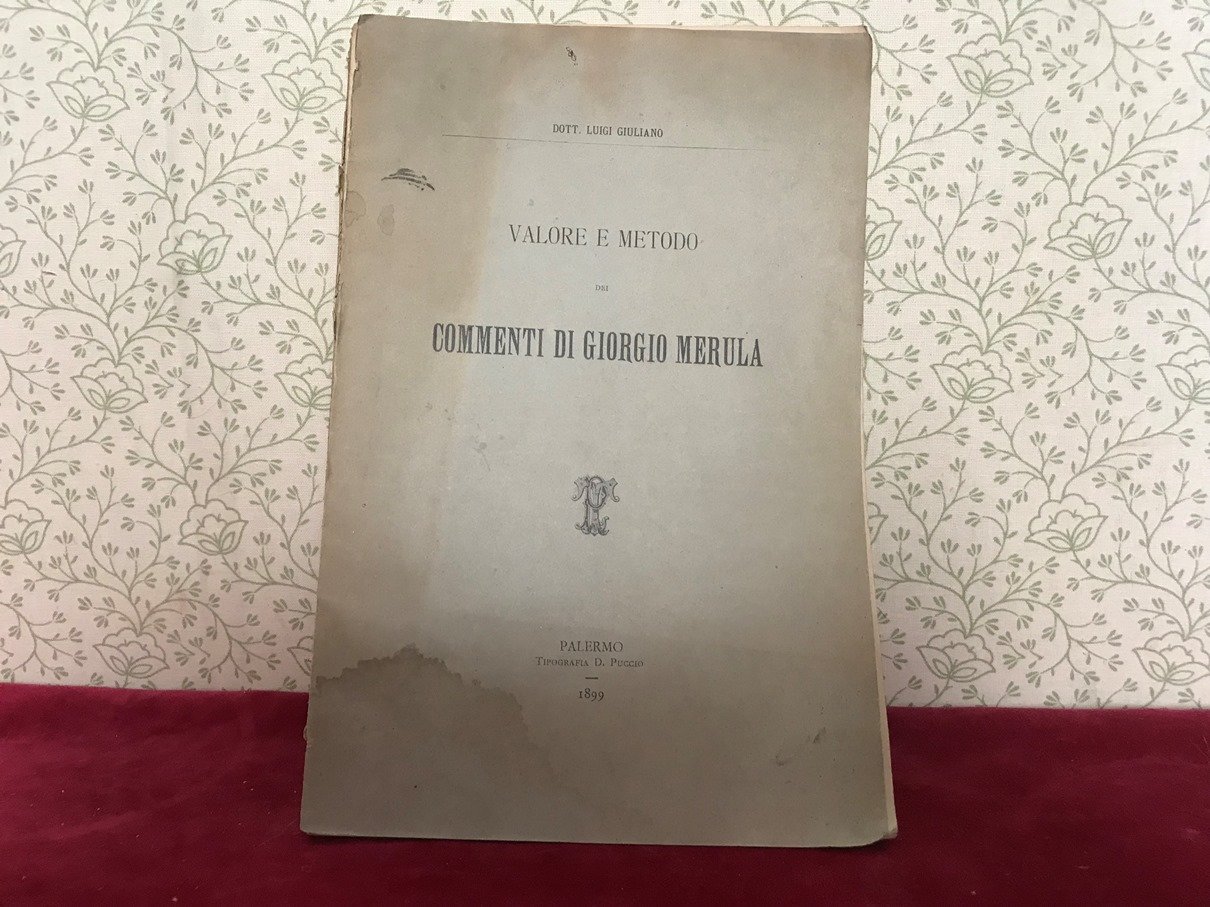 Opuscolo in 8, brossura editoriale, titolo al piatto, frontespizio, 51 pp., indice ed errata. Interessante saggio filologico su Giorgio Merlano di Negro (Merula), umanista e storico alessandrino del XV secolo, famoso commentatore di classici, di cui l'autore esamina ed analizza il metodo accurato, sagace e minuzioso dell'arte oratoria e filologica dei commenti. Interessante e poco comune. Qualche menda alla brossura (e piatto anteriore slegato), per il resto in bello stato.