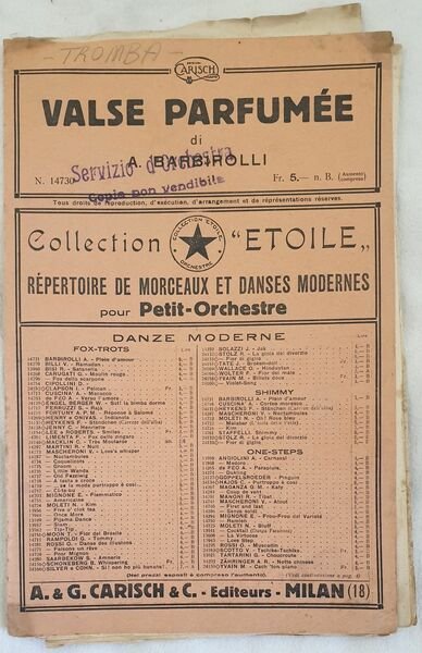 Partitura per orchestra degli anni '30 della melodia di A. Barbirolli "Valse parfumee". Copertina morbida editoriale. GENERE: Valzer STRUMENTI: violini; violoncello; contrabasso, tromba, trombone, clarinetto, timpano, flauto ANNO: anni '30 DIMENSIONI: In 8. cm 27,5x18<BR>PAGINE: pp. 9 CONDIZIONI: Buone condizioni. Ex libris in copertinaScore for orchestra of 1930's of the melody of A. Barbirolli "Valse parfumee". Editorial soft cover. MUSIC: Danza di contadini STRUMENTI: violin; violoncello; contrabbass, trumpet, trombone, clarinet, timpano, flute YEAR: 1930's SIZE: In 8. cm 27,5x18 PAGES: pp. 9 CONDITIONS: Good conditions. Ex libris in the cover