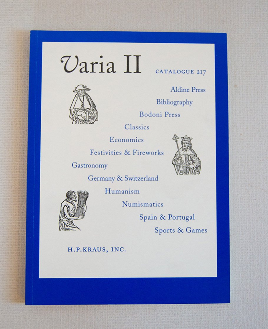 Varia II. Aldine Press, Bibliography, Bodoni Press, Classics, Economics, Festivities & Fireworks, Gastronomy, Germany & Switzerland, Humanism, Numismatics, Spain & Portugal, Sports & Games.