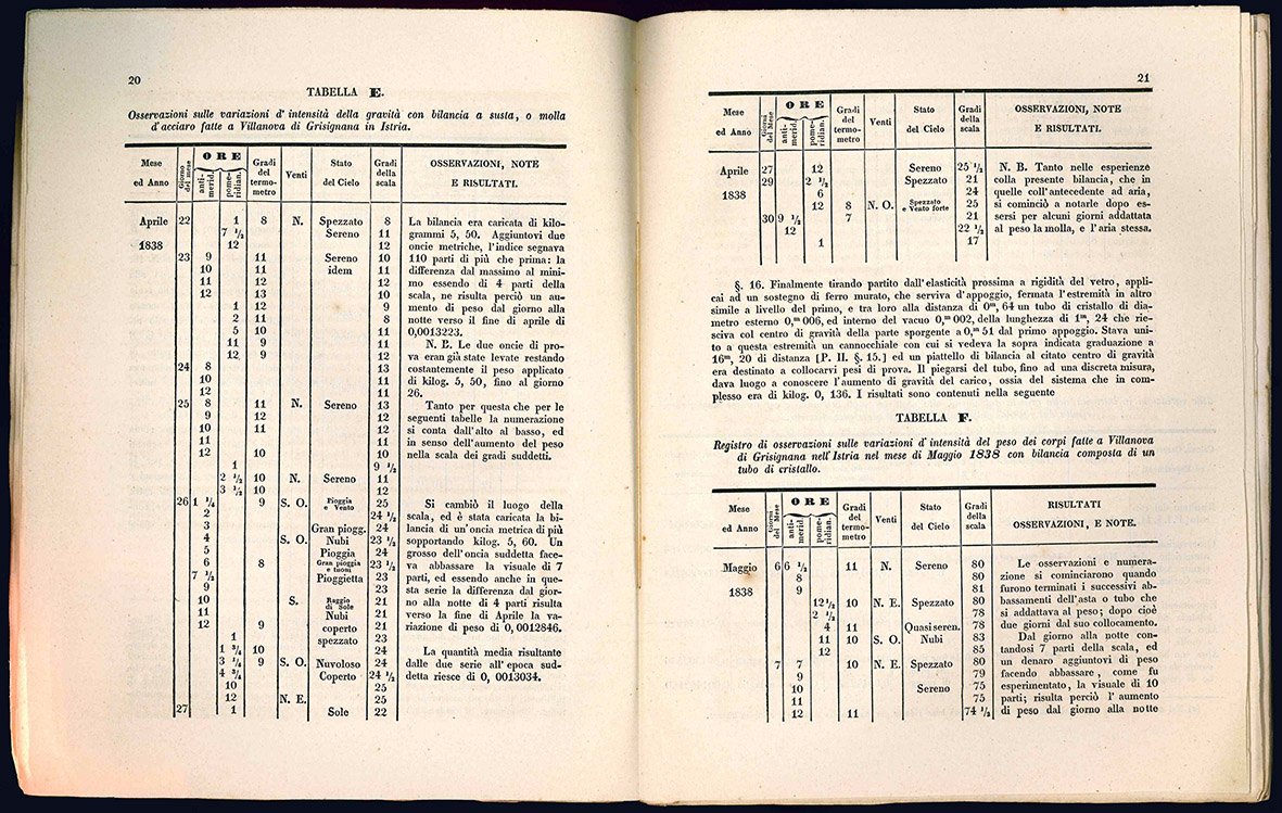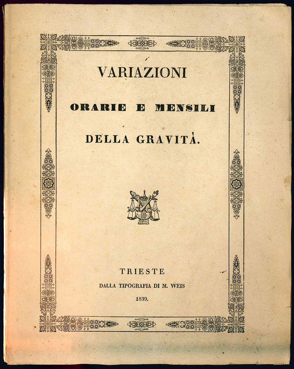 Bellissima copia a fogli chiusi. Con invio autogr. dell'A. (nome del destinatario cancellato). Le variazioni della gravità sono messe in relazione non solo con altri fenomeni fisici, ma anche con le nascite e le morti. L'A., matematico, disegnò e fece stampare a Trieste una grande carta ufficiale dei territori del Ducato Estense.