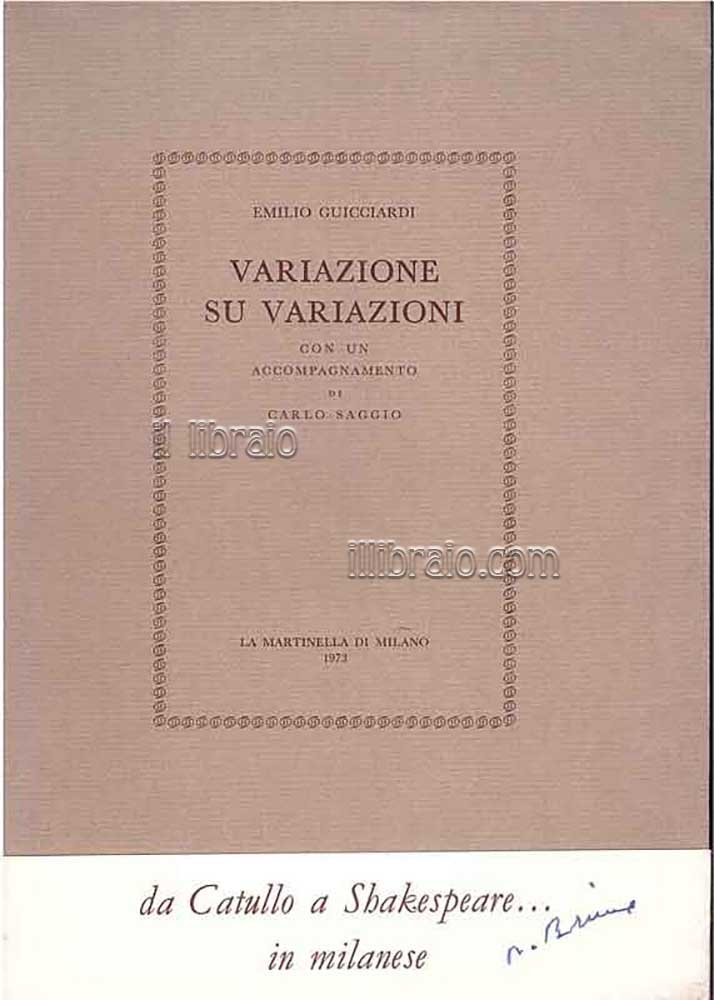 in 8°; pp. 72; br. con sovracop. e fascetta. Con un accompagnamento di Carlo Saggio. Famose poesie, preghiere e pezzi teatrali tradotti in dialetto milanese. Tiratura di 500 esemplari numerati. Testo italiano - inglese - milanese *esemplare firmato dall'autore